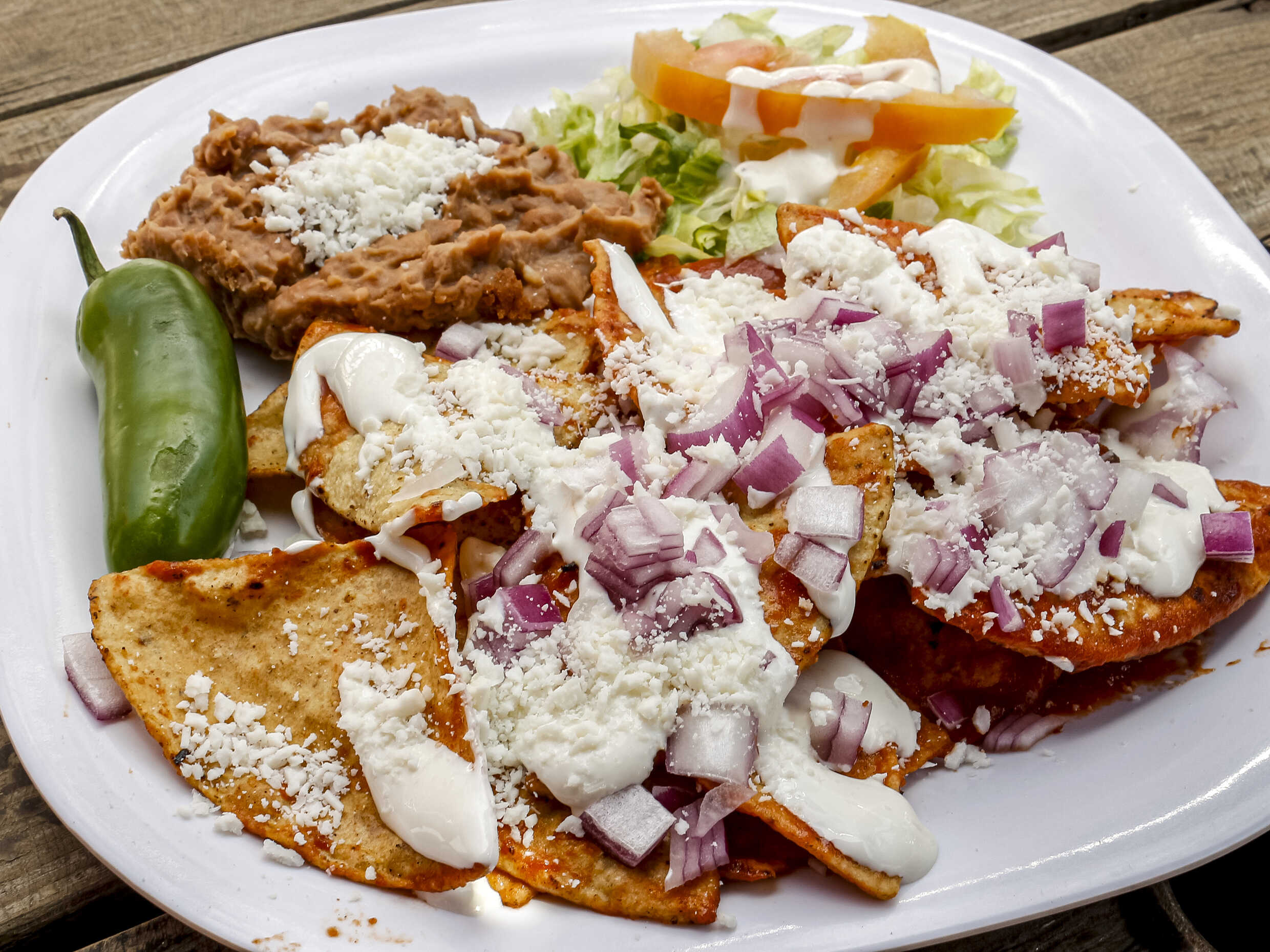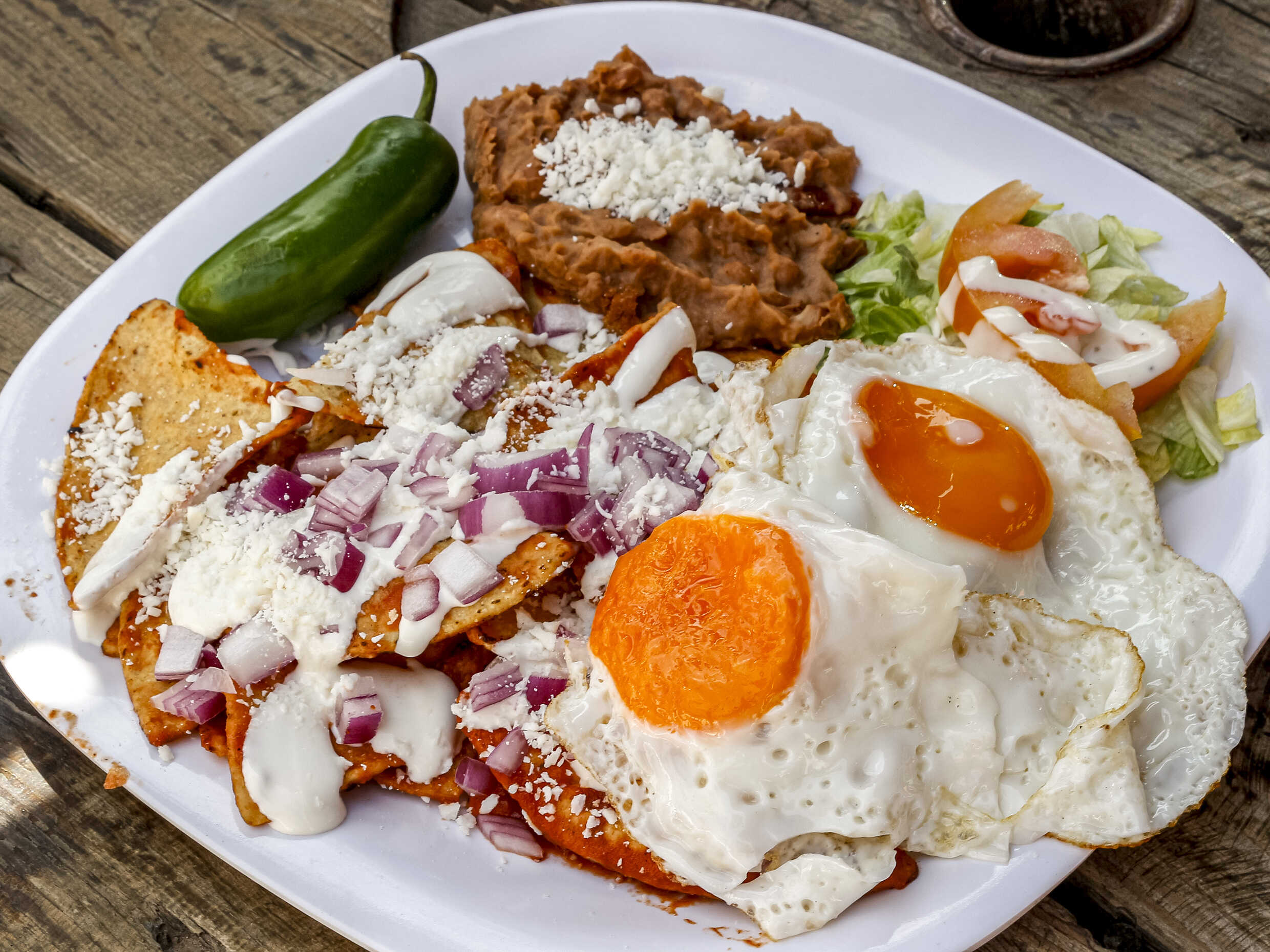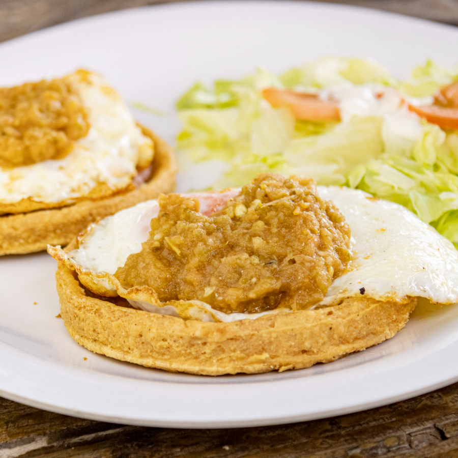 Tortilla doradita al momento con salsa de la casa,crema,cebolla,cilantro,queso cotija,2 huevos al gusto acompañado de frijol reffito y ensalada.