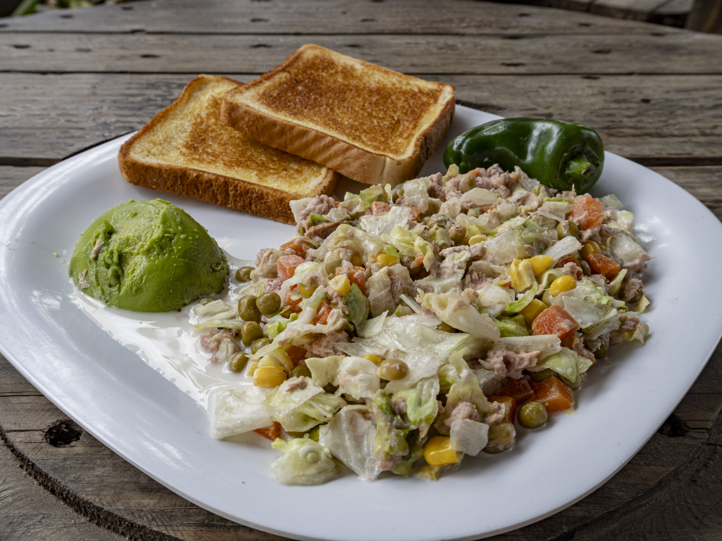 Pan tostado con mantequilla, atún, vegetales mixtos, mayonesa, lechuga y aguacate