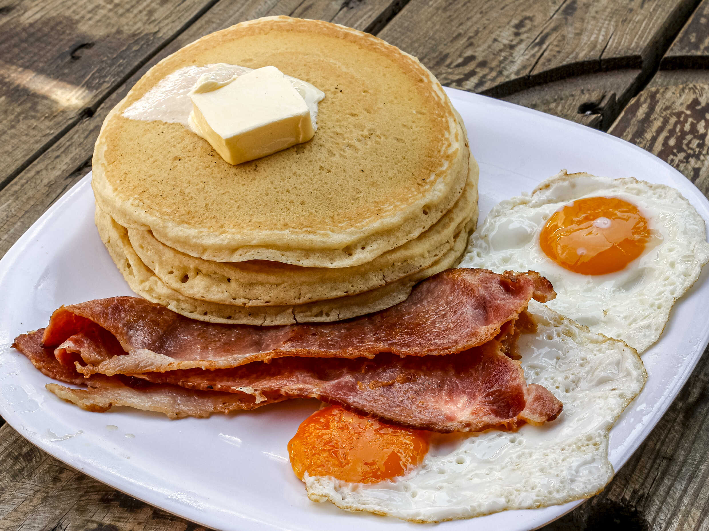 3 hot cakes con mantequilla y miel de maple, 2 huevos al gusto y tocino doradito.