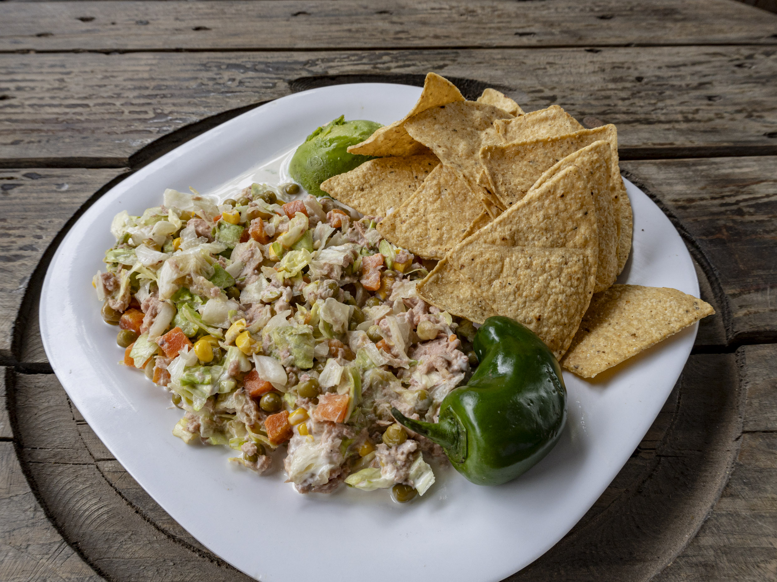 Totopos, atún, vegetales mixtos, mayonesa, lechuga , aguacate.