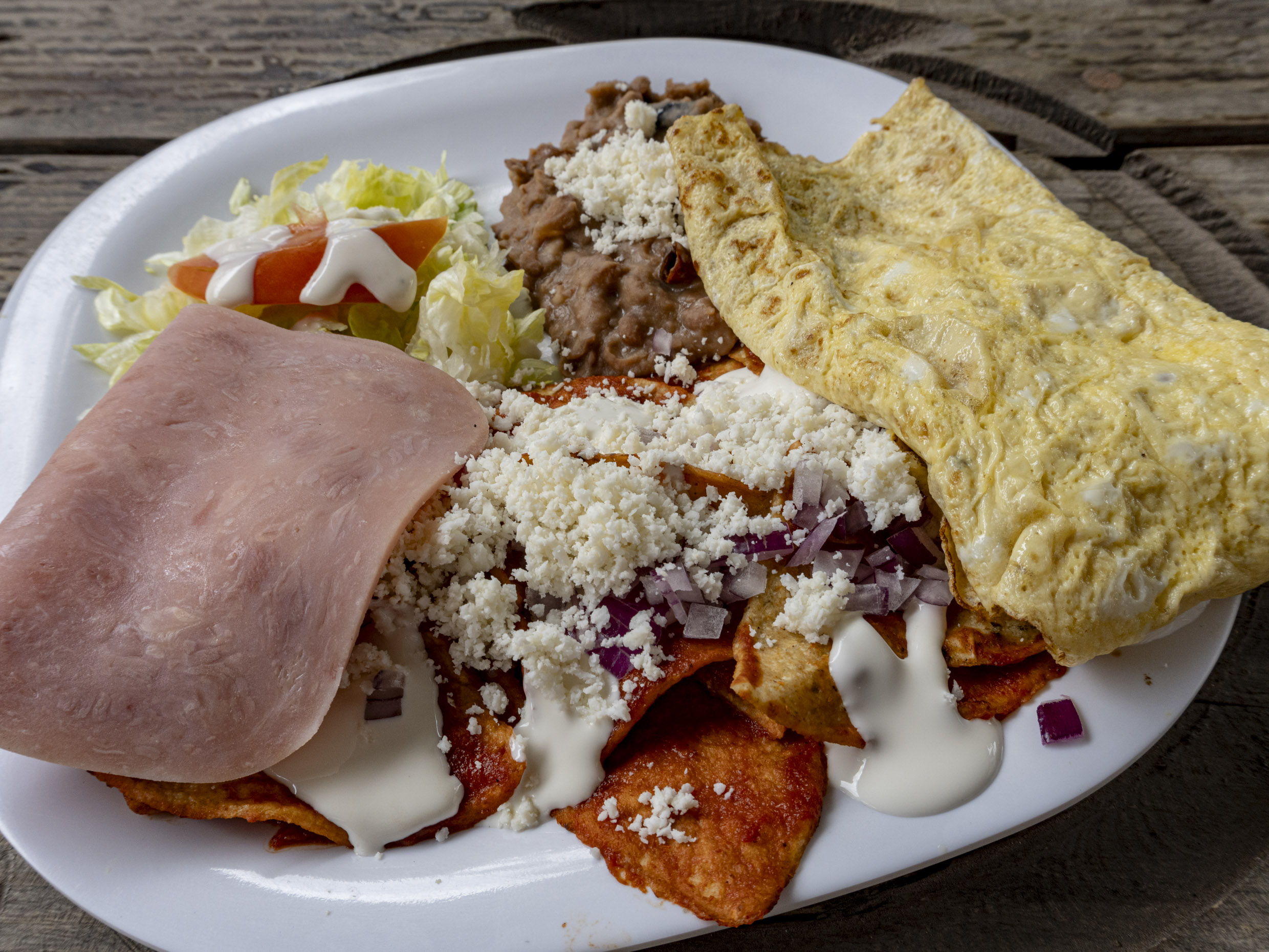 Chilaquiles con huevo y jamón doradito ensalada y frijoles