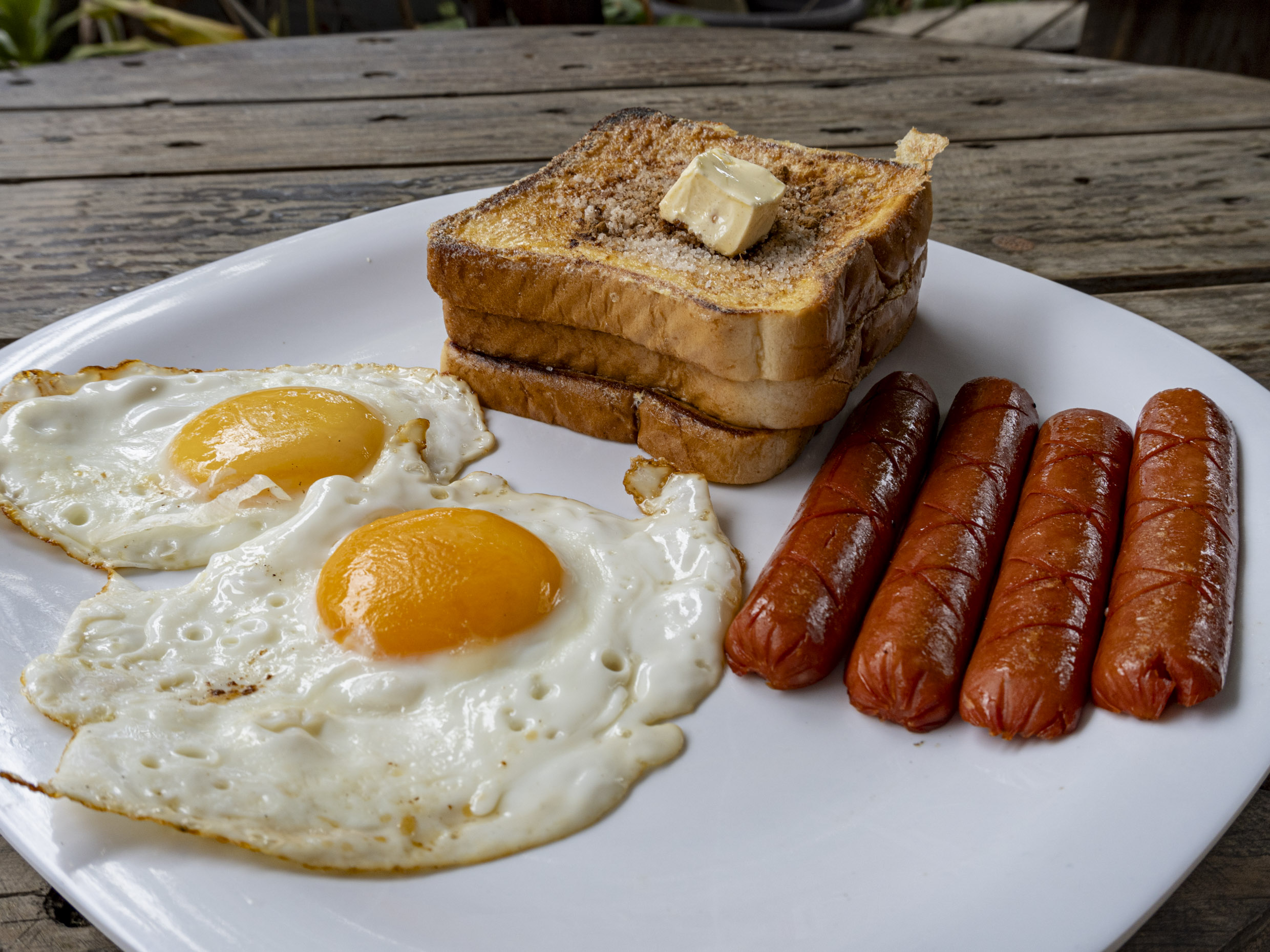 Pan capeado con huevo acompañando de mantequilla y miel de Maple y 2 huevos revuelto o estrellado.