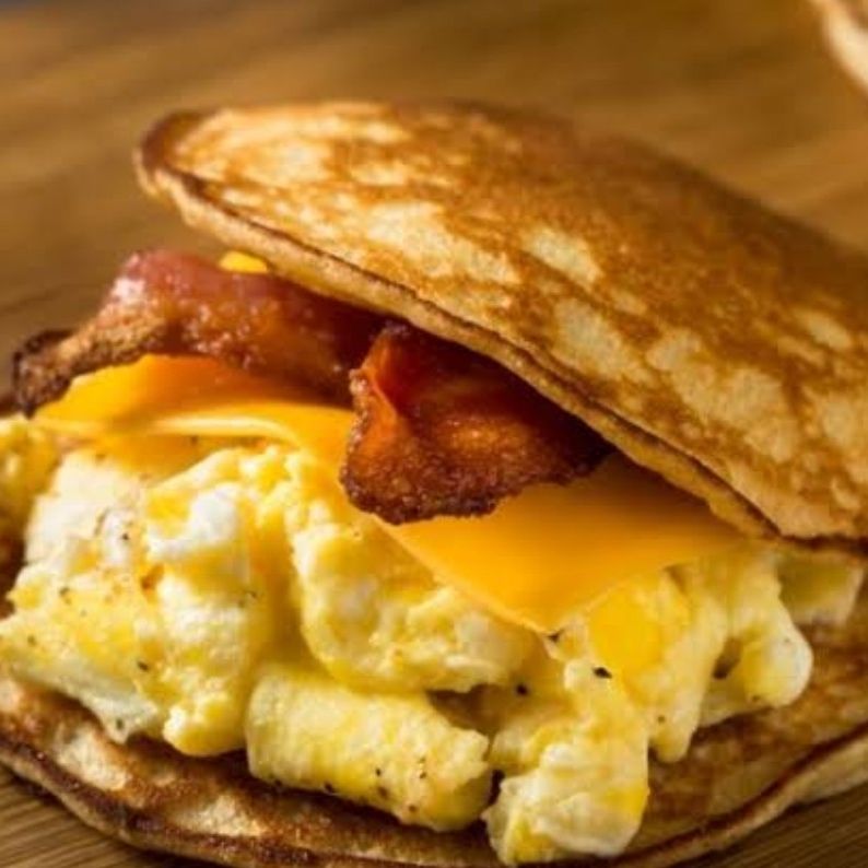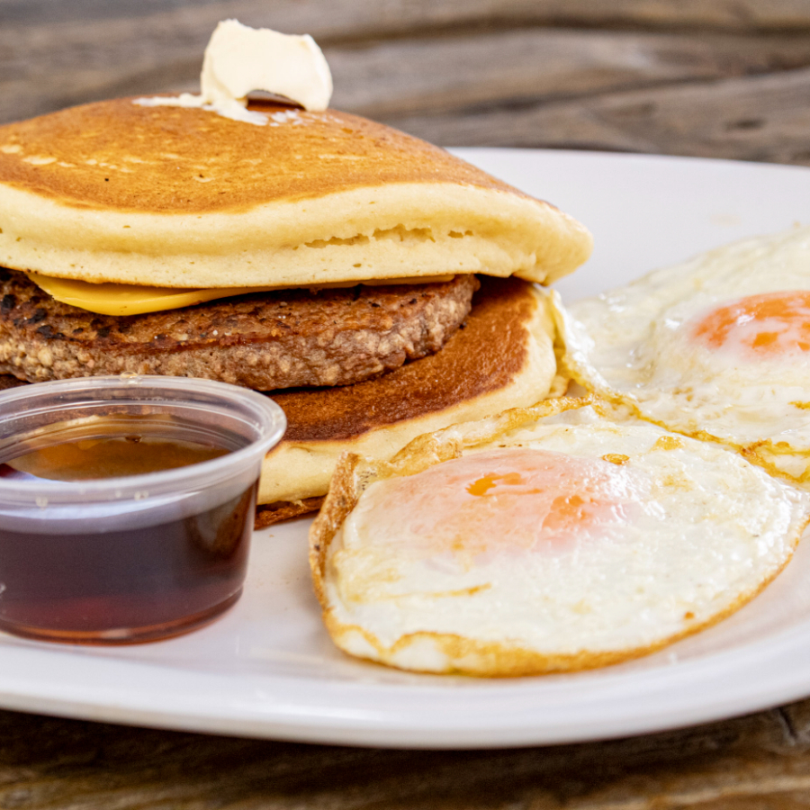Carne de res queso amarillo 2 huevos revueltos en Medio de 2 hotcakes con mantequilla y miel de Maple