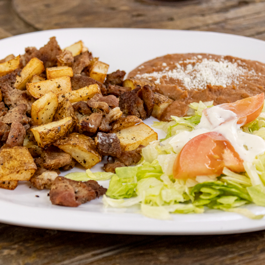 Bksteck revuelto con papas, ensalada, fríjol y tortillas