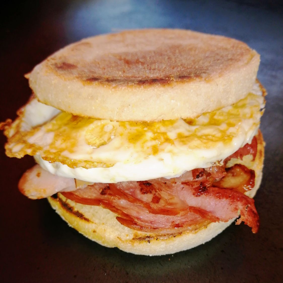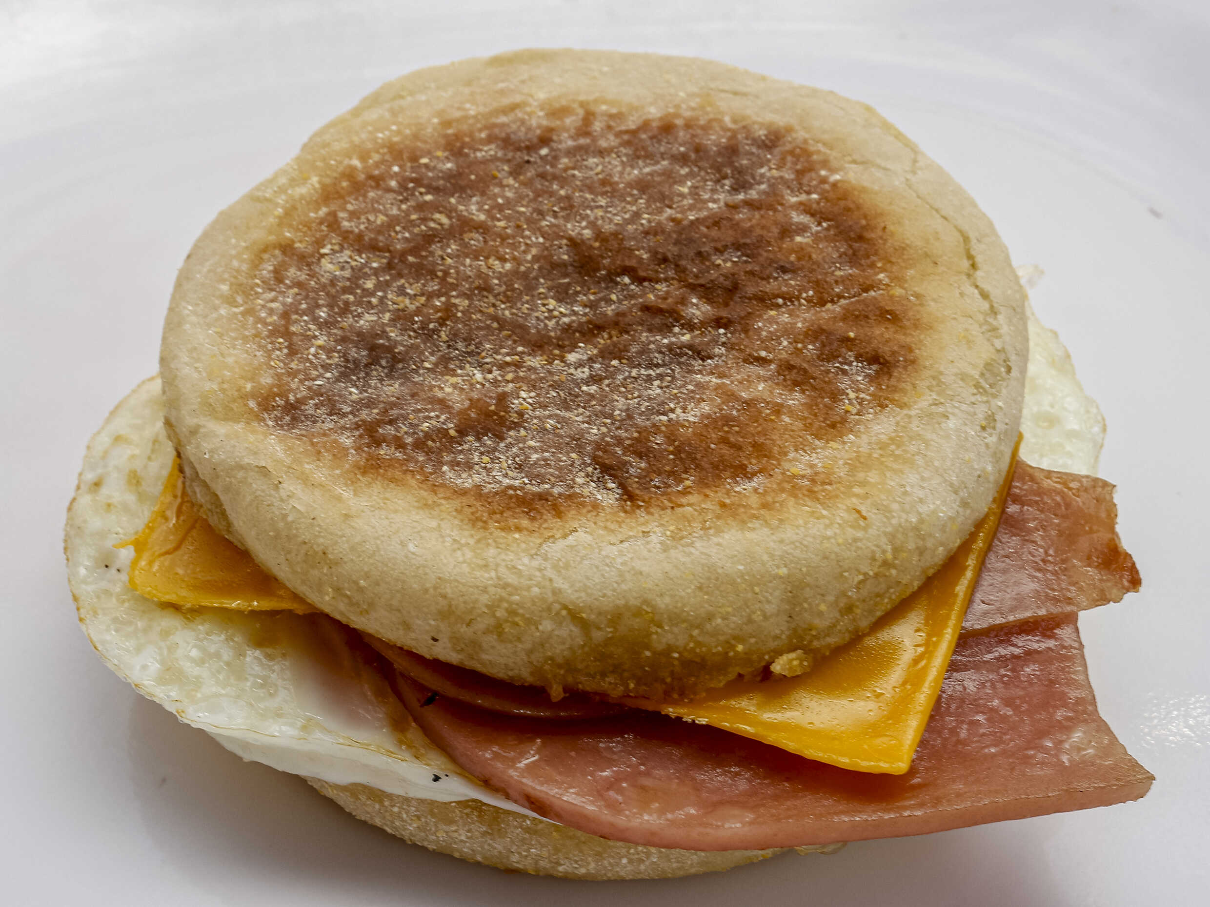 Pan muffin con huevo, tocino, jamón y queso