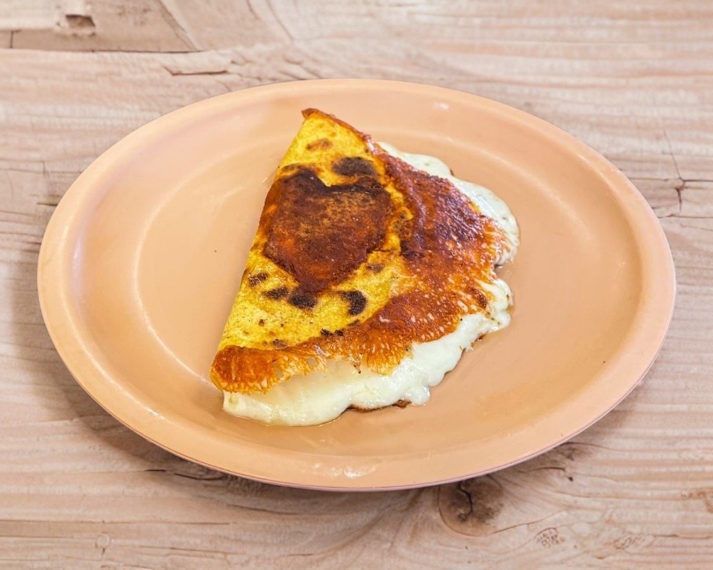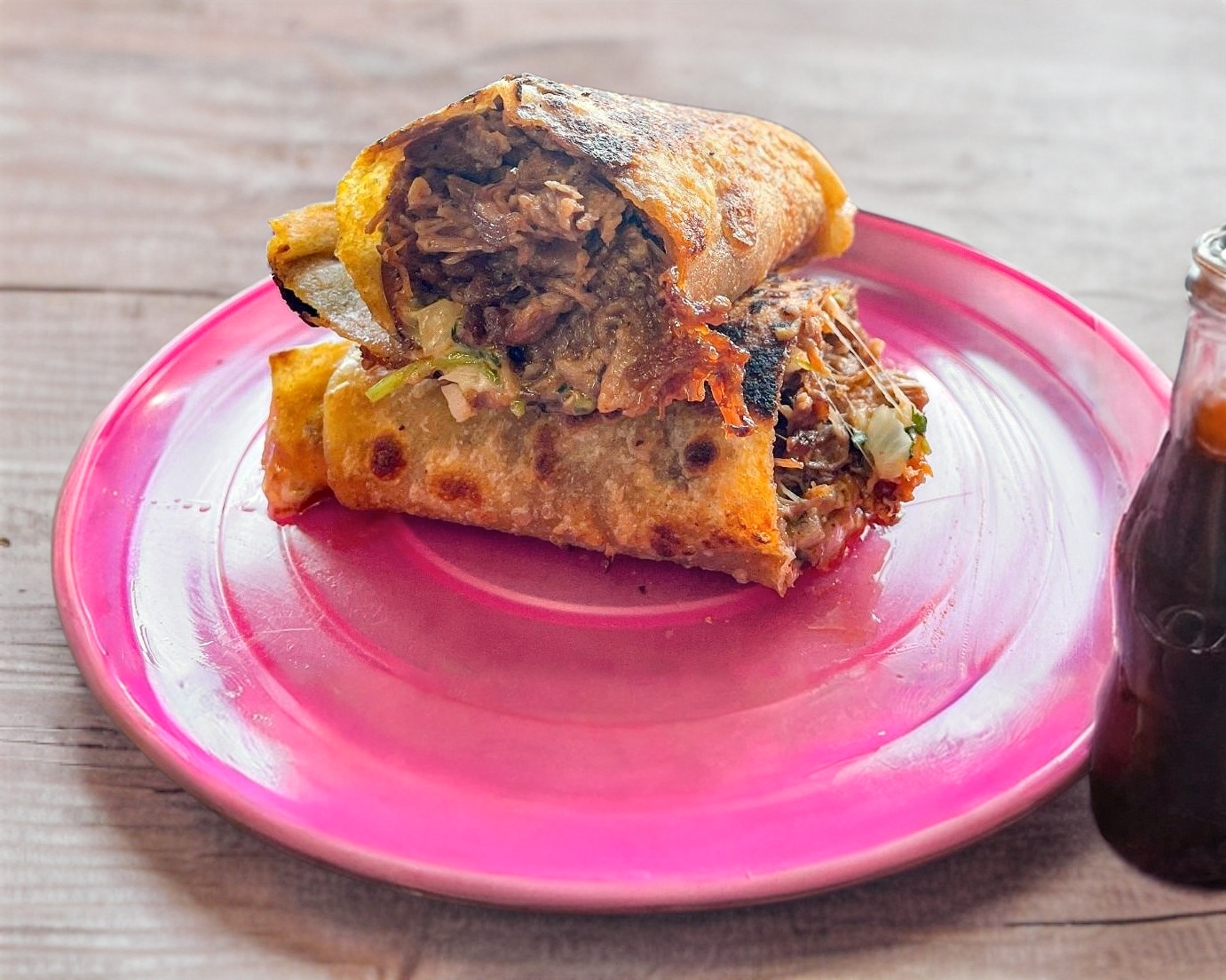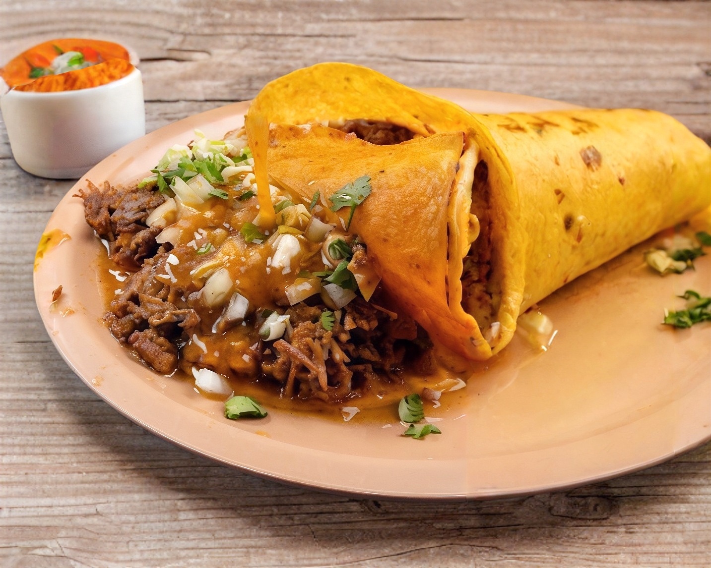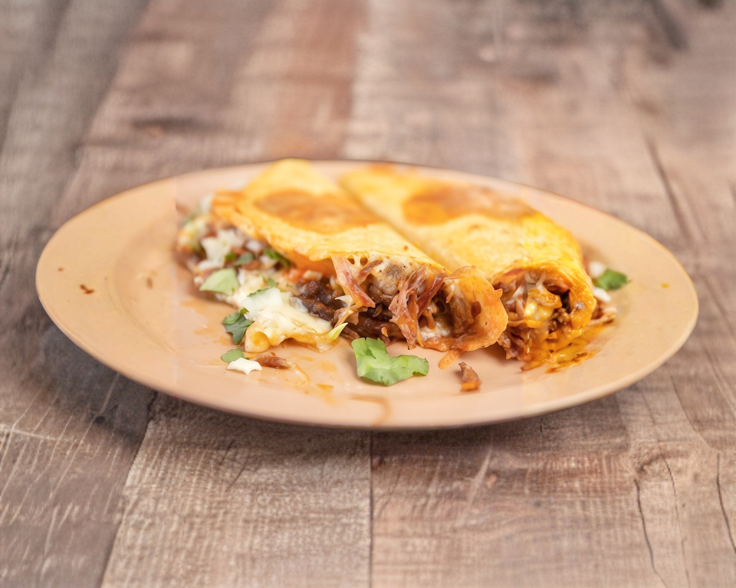 Torrilla de harina con queso, carne tatemada, frijoles, cilantro y cebolla