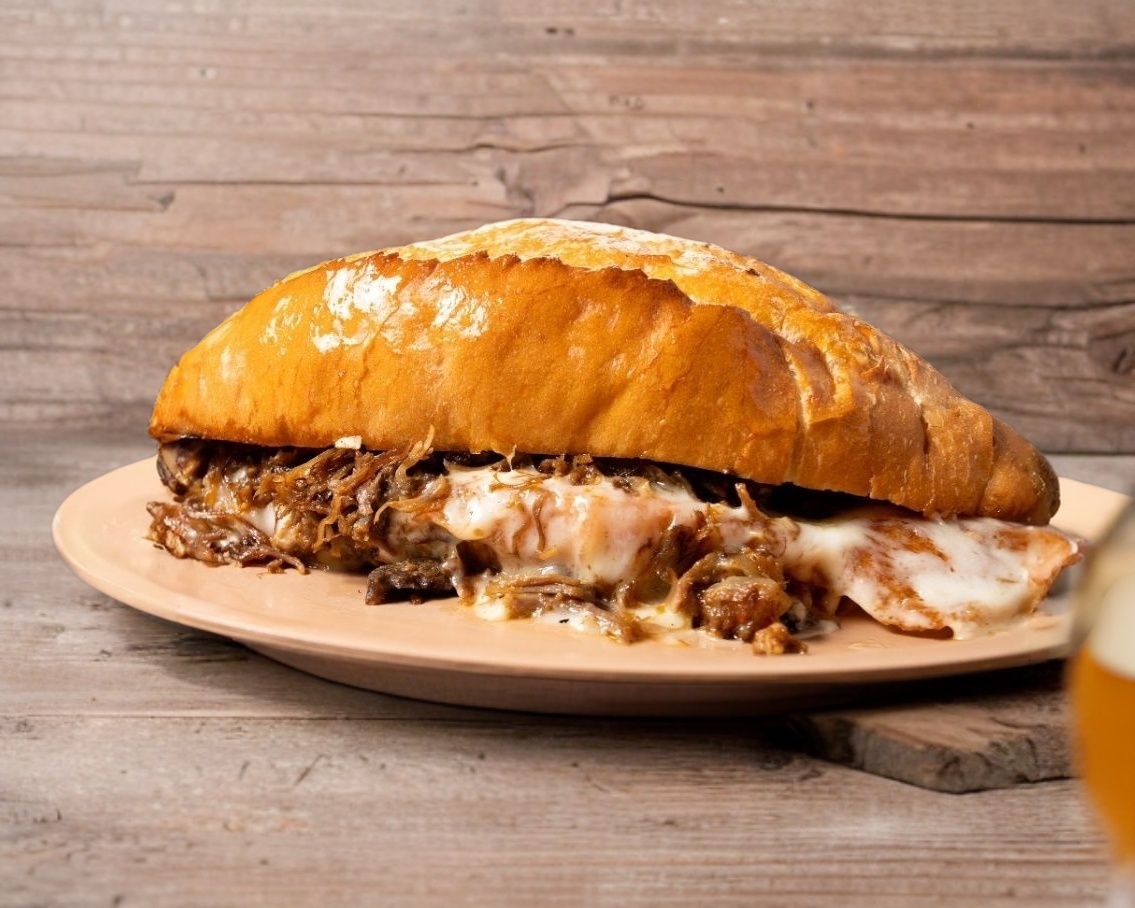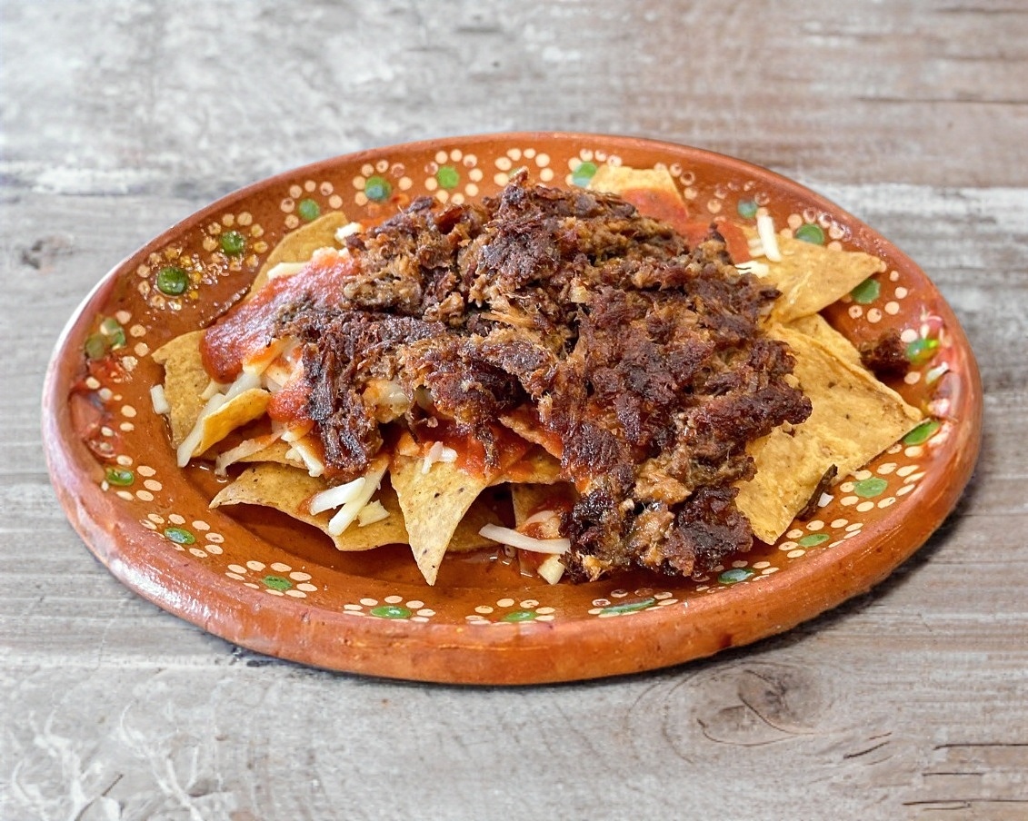 Pan con queso y carne de birria tatemada, repollo, cebolla, limones y salsa.