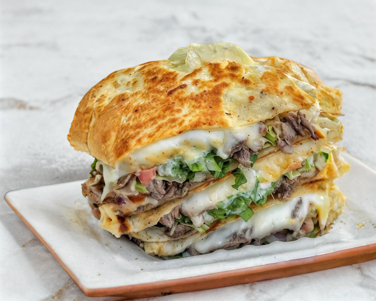 Es una quesadilla gigante con carne asada, queso Monterey.