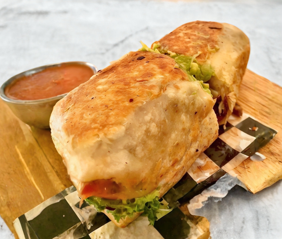 Es una quesadilla gigante con pastor doradito a la parrilla y mucho queso monterrey.