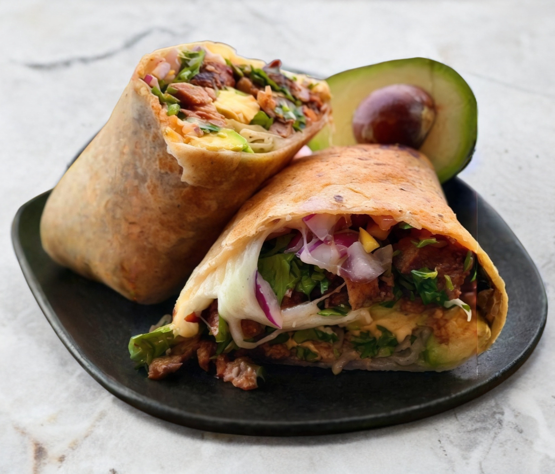 Es un burro mixto con asada y pastor y burro de buen tamaño, queso monterrey, cebolla, cilantro y aguacate.