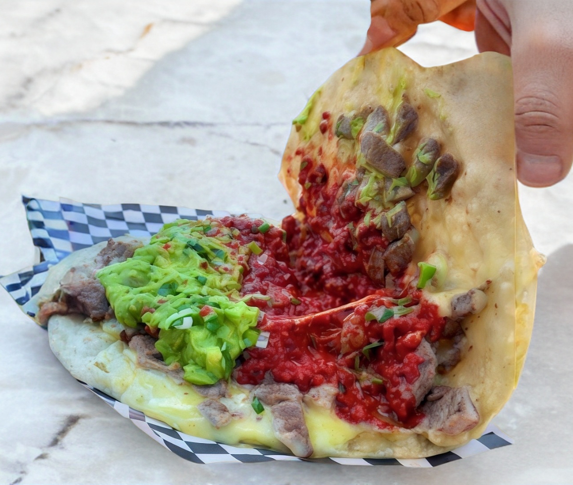 Es una quesadilla gigante con carne asada, chorizo sonorense y queso Monterey.