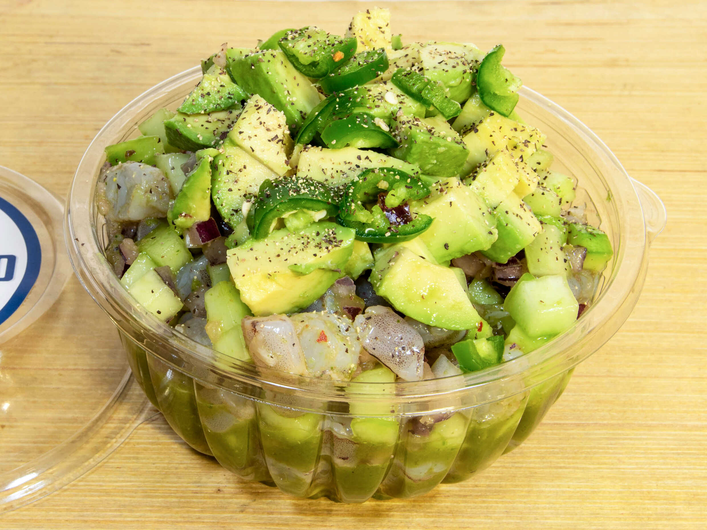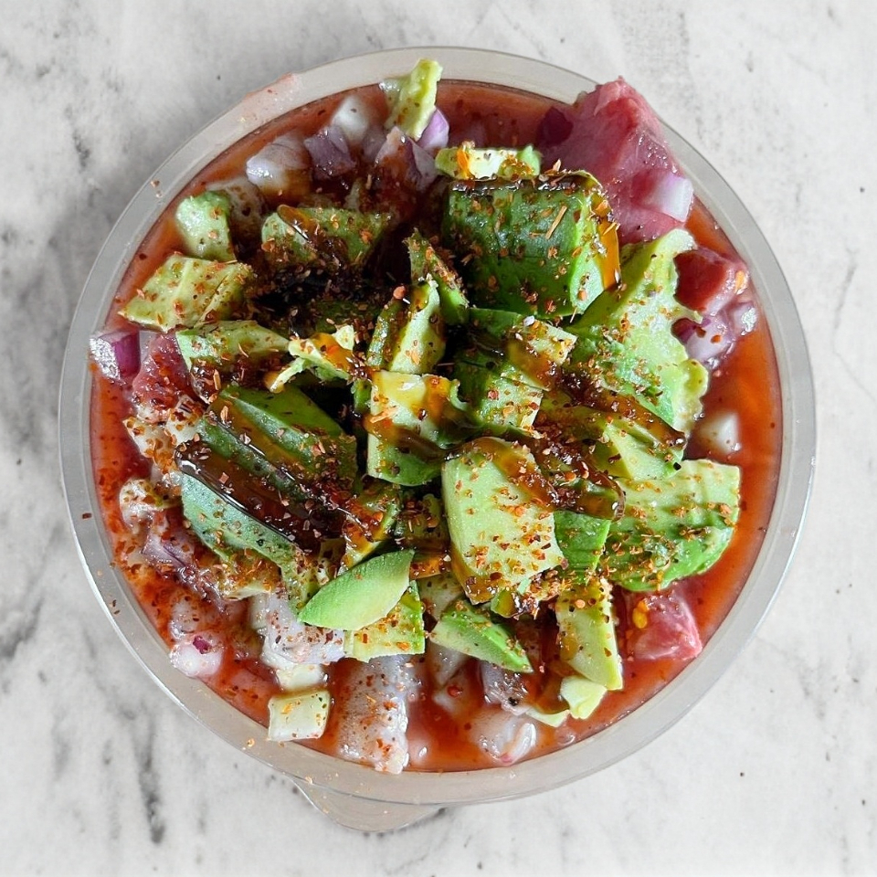 Camarón curtido, cocido, medallon de atun o mixto bañado en salsa Cevicheño, chile de arbol, acompañado de tomate, pepino y cebolla, topping de aguacate y serrano.