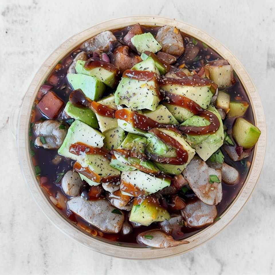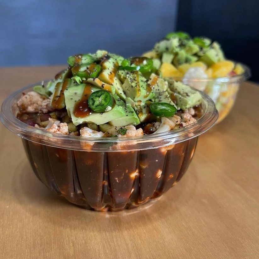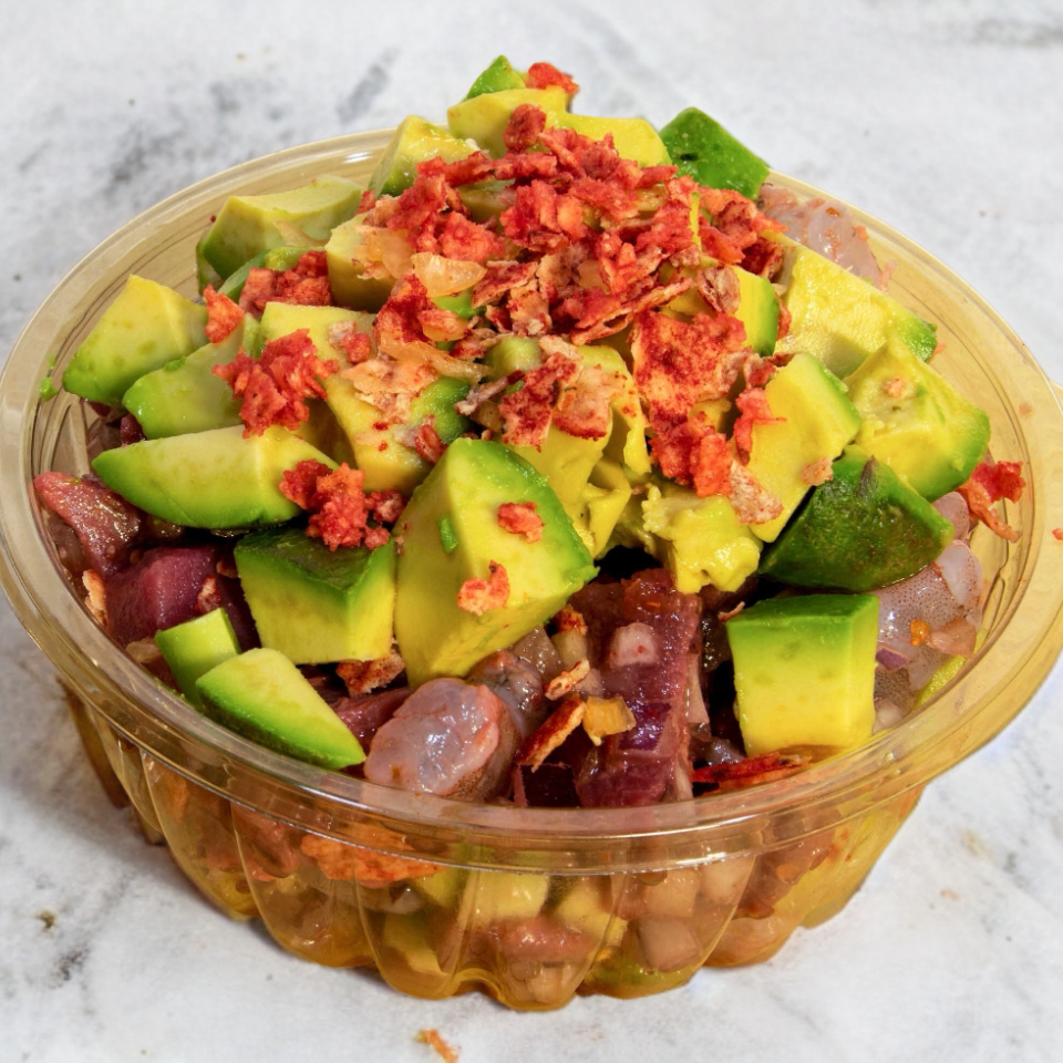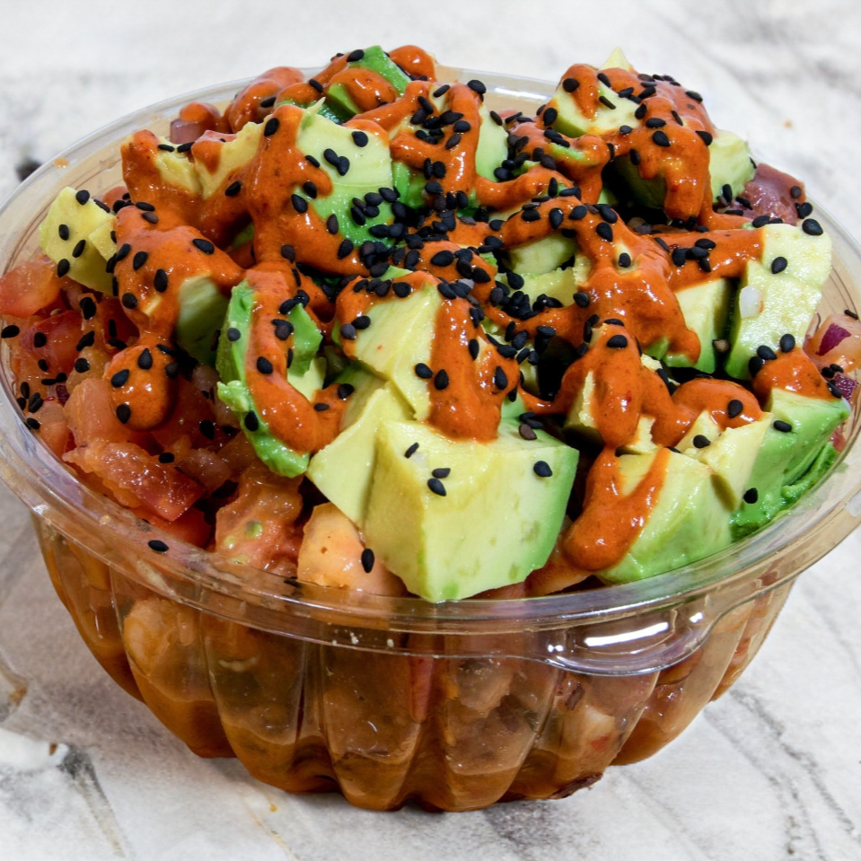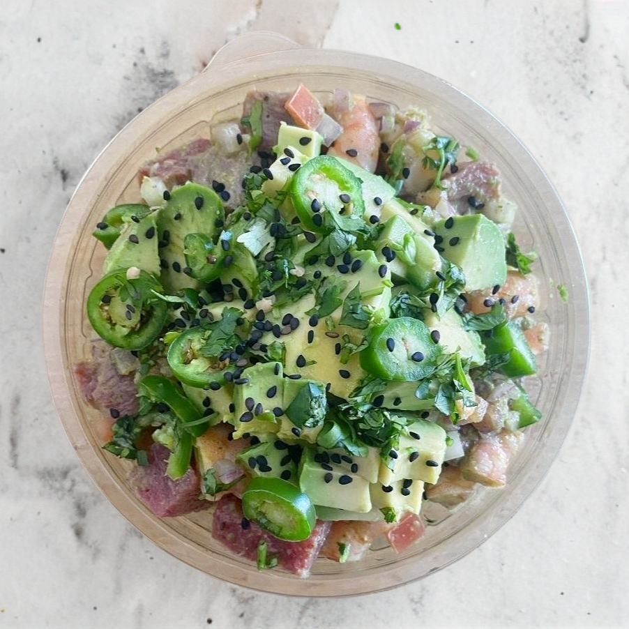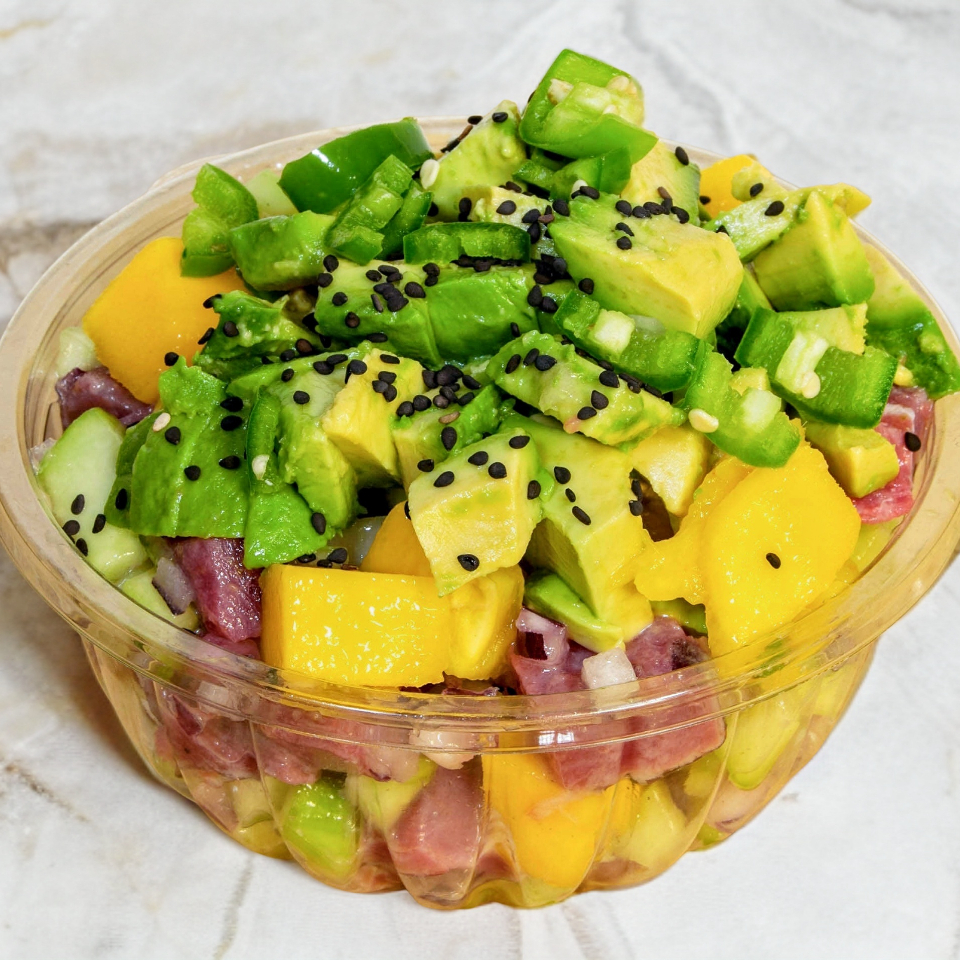 Cubitos de atún sazonados, trozos de mango, cebolla morada, pepino y chile serrano. Topping: Aguacate, ajonjolí tostado.