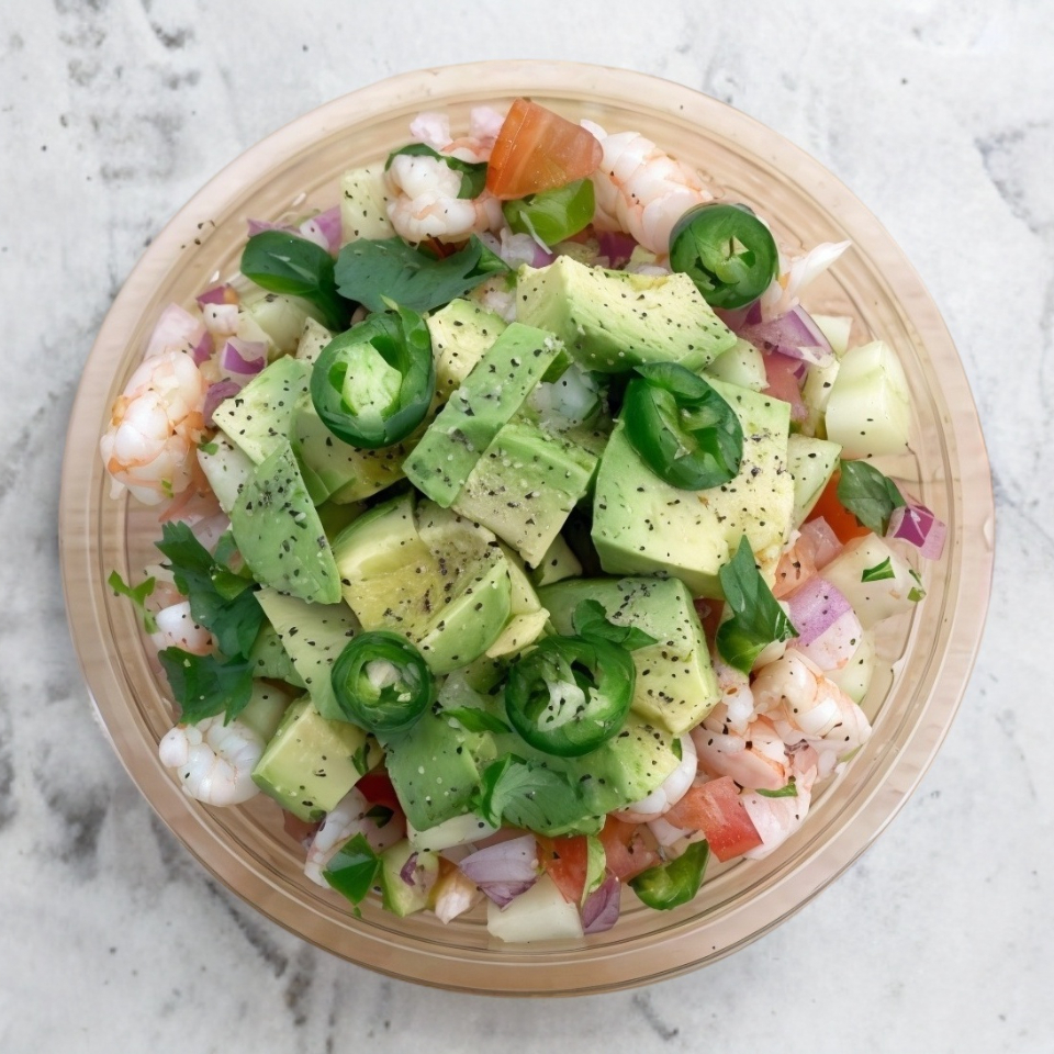 Camaron curtido picados bañados en una salsa verde hecha a base de chile serrano, acompañados de pepino, cebolla y un topping de aguacate con rodajas de chile serrano y pimienta negra.