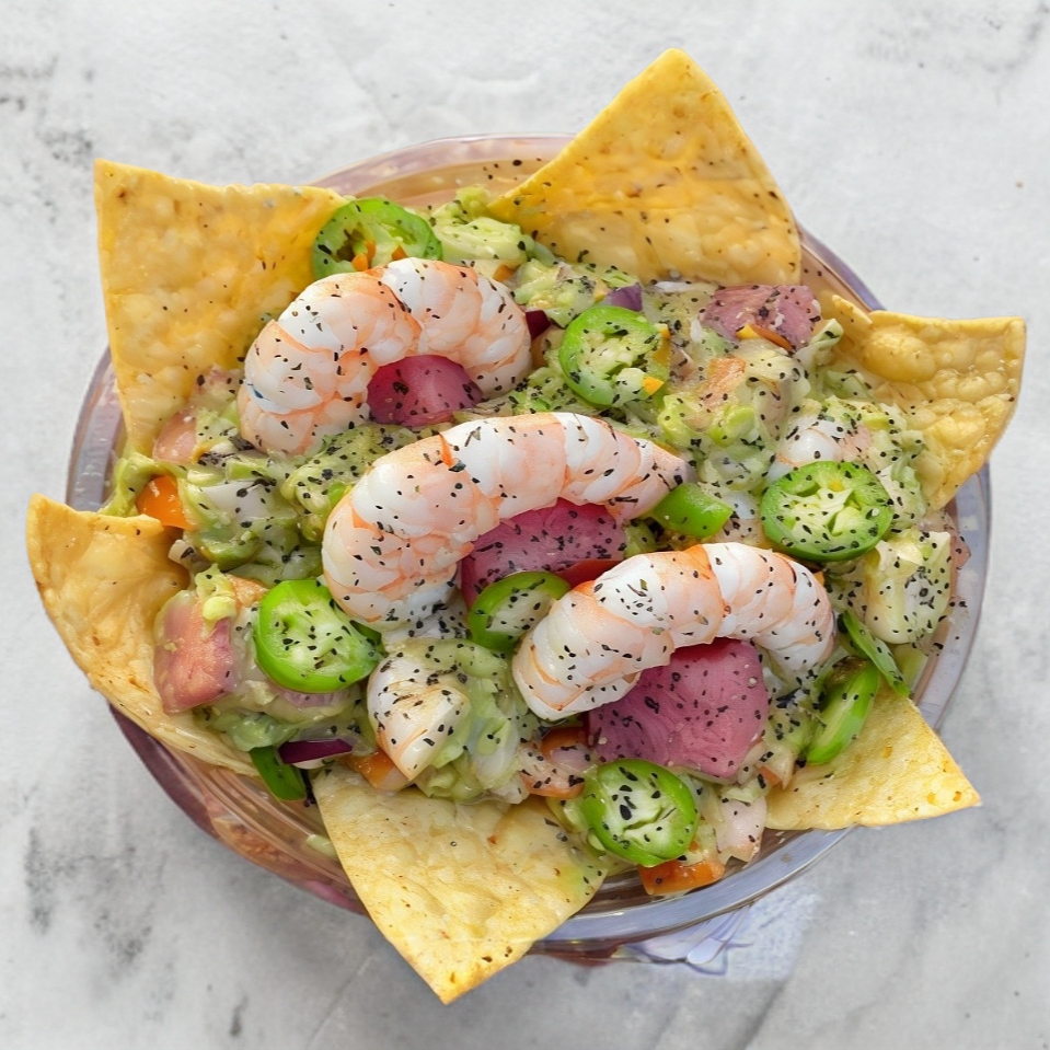 Trozos de camarón y cubitos de atún en crema cilantro-serrano, tomate y cebolla morada. Topping: Aguacate, ajonjolí tostado, Cilantro y Serrano.
