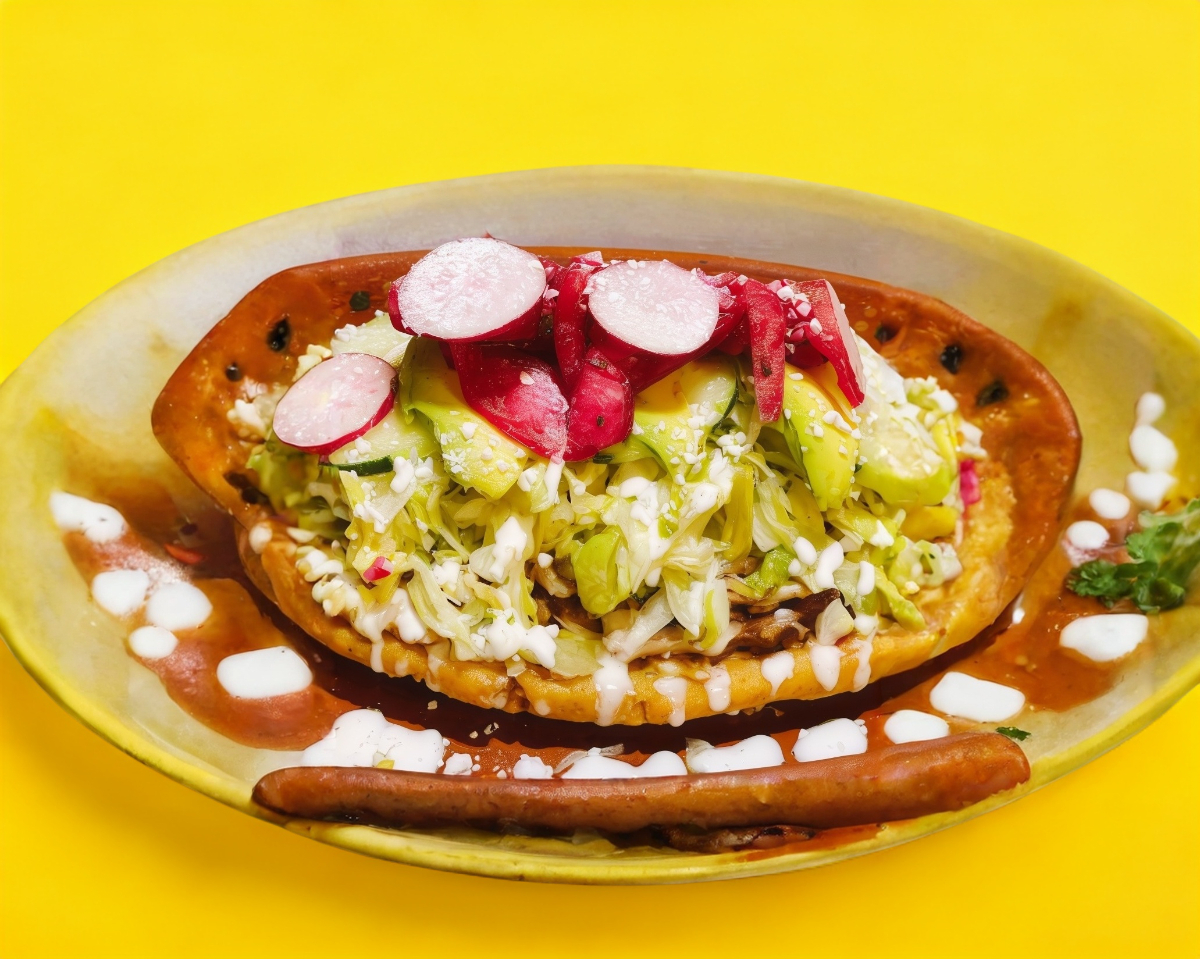 Pan relleno con carne estilo birria, acompañado de salsa.