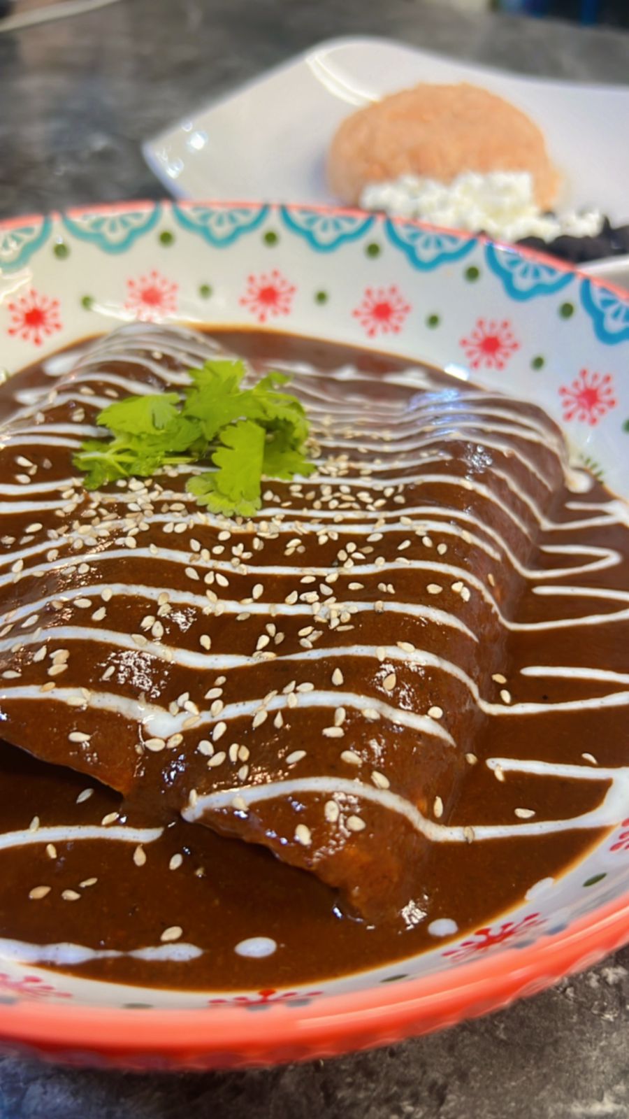 3 enchiladas rojas, empanada con queso y un ingrediente, taco de barbacoa