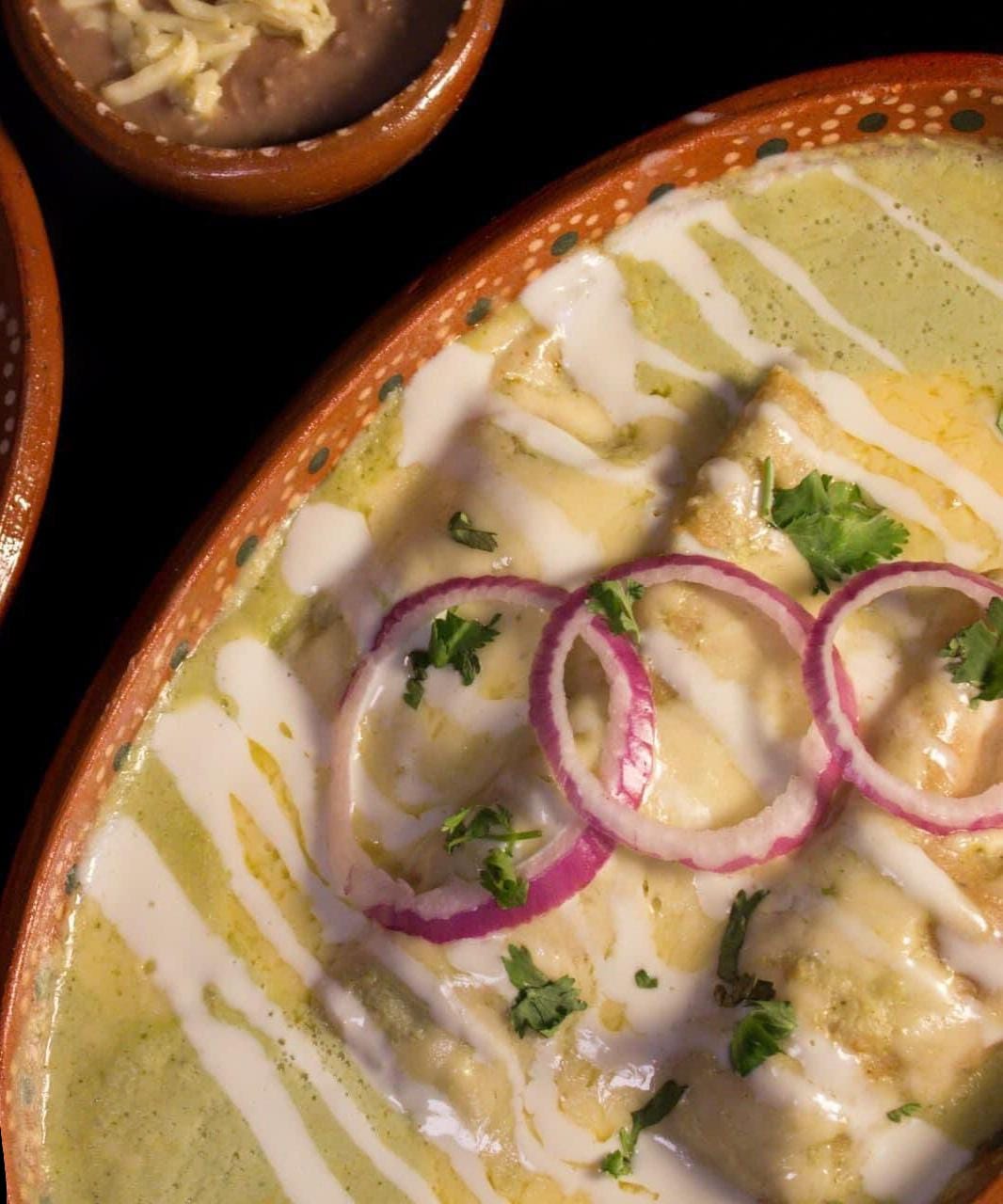 Cinco tortillas rellenas bañadas en salsa cremosa.