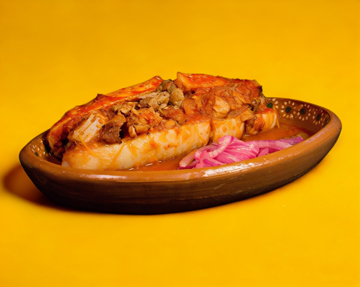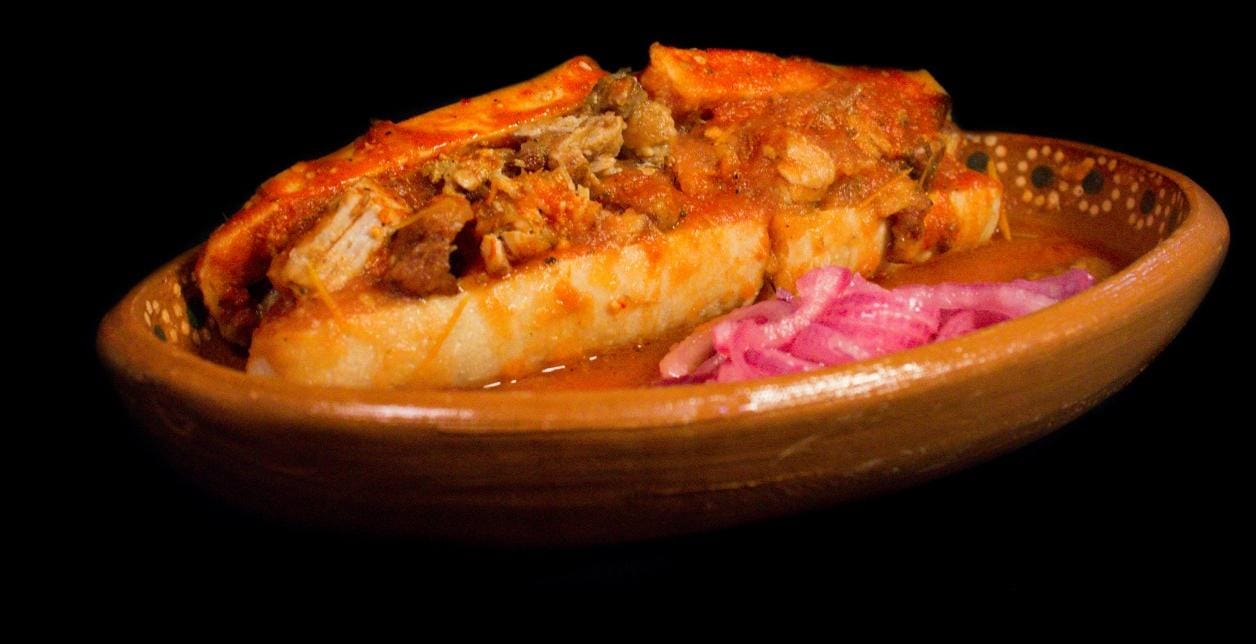 Torta estilo Jalisco bañada en salsa picante de chile de árbol.