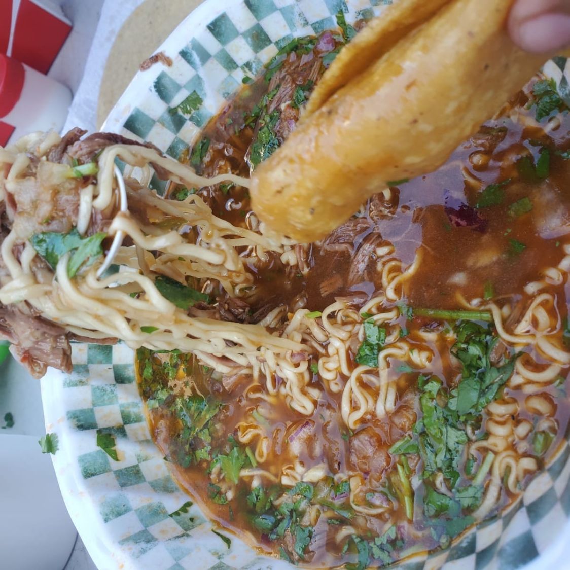 Birria en caldo con pasta Maruchan, vaso de 32 oz con 12 tortillas para 2 personas.