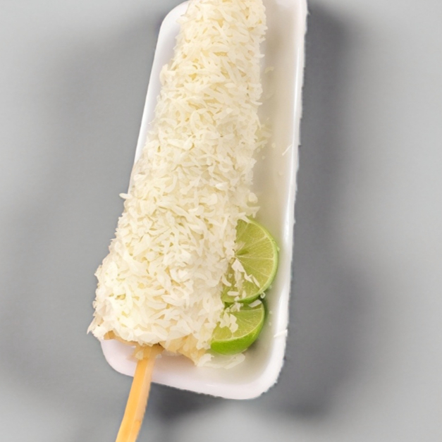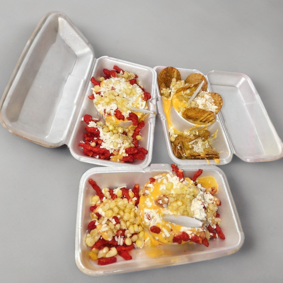 Elote entero forrado de chettos flamin y bañado con queso amarillo