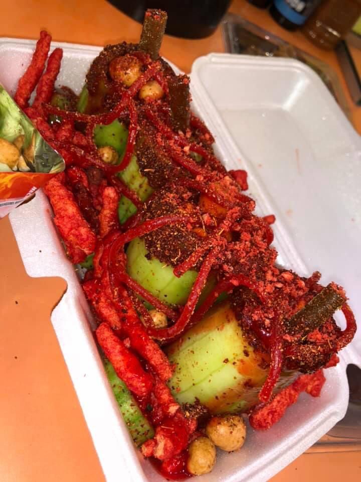Fruta picada preparada con chamoy, Tajín y limón ( sandía , pepino, piña y jícama)