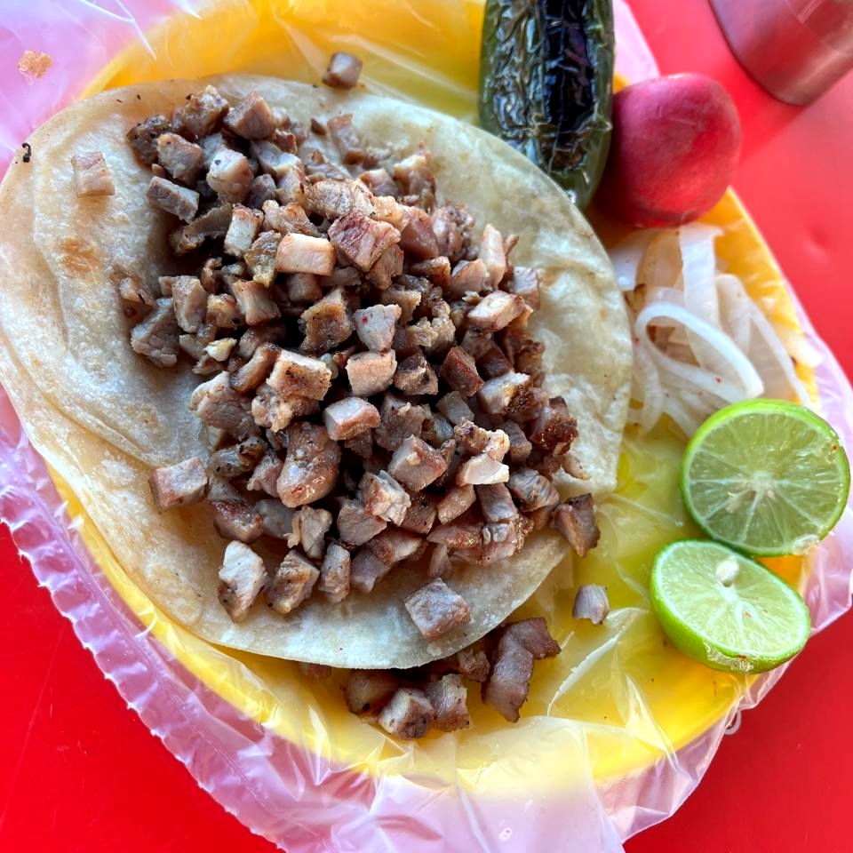 Tortilla de harina,asada de puerco,limon,guacamole,chile toreado,repollo,cebolla,rábanos,salsas de la casa