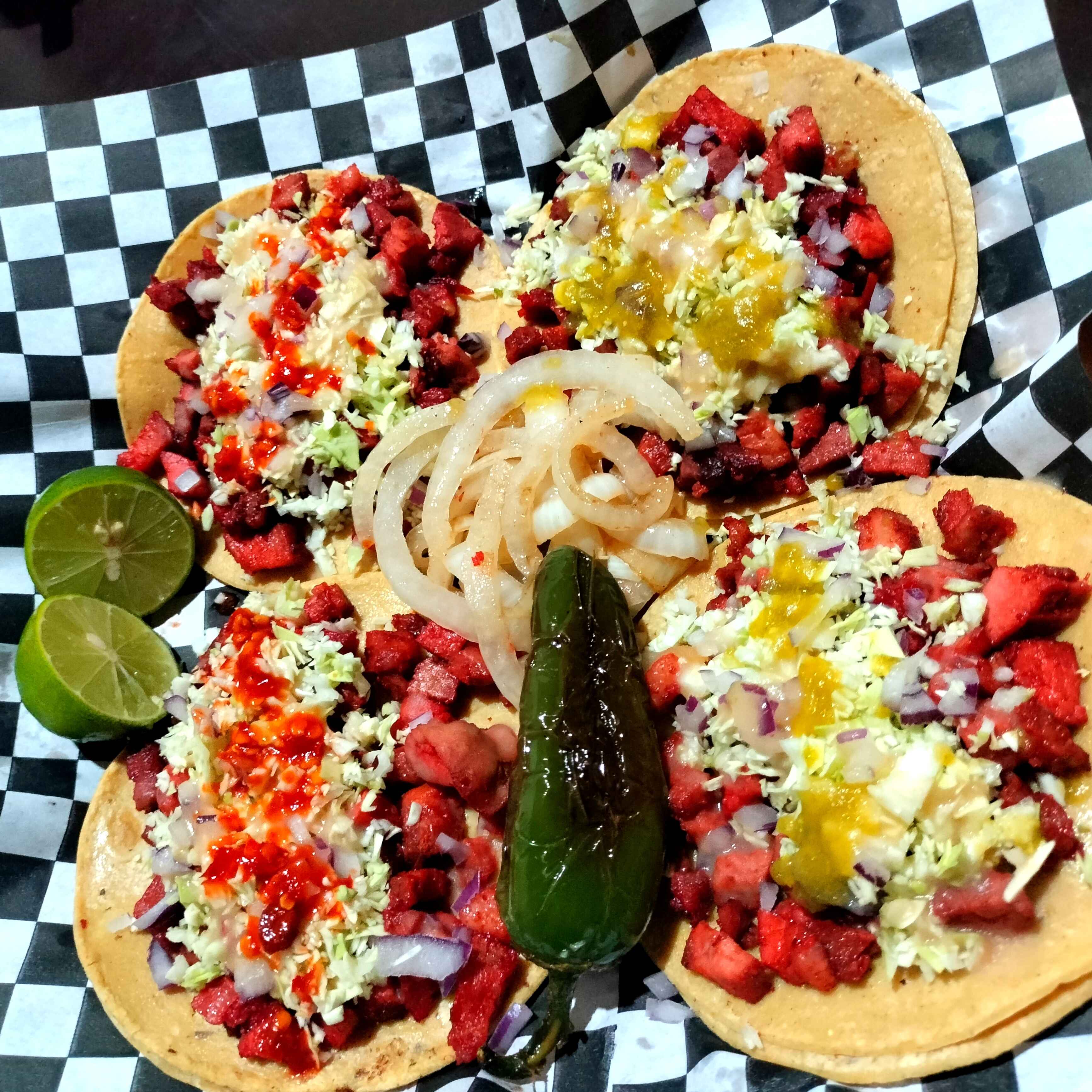 Doble Tortilla de maíz,carne asada,chile toreado,rábano,cebolla guisada,limón y salsas de la casa
