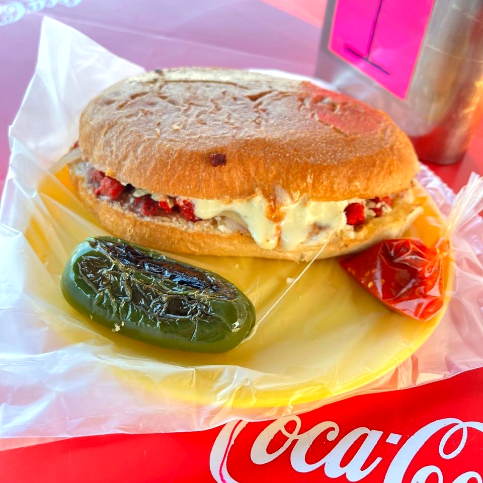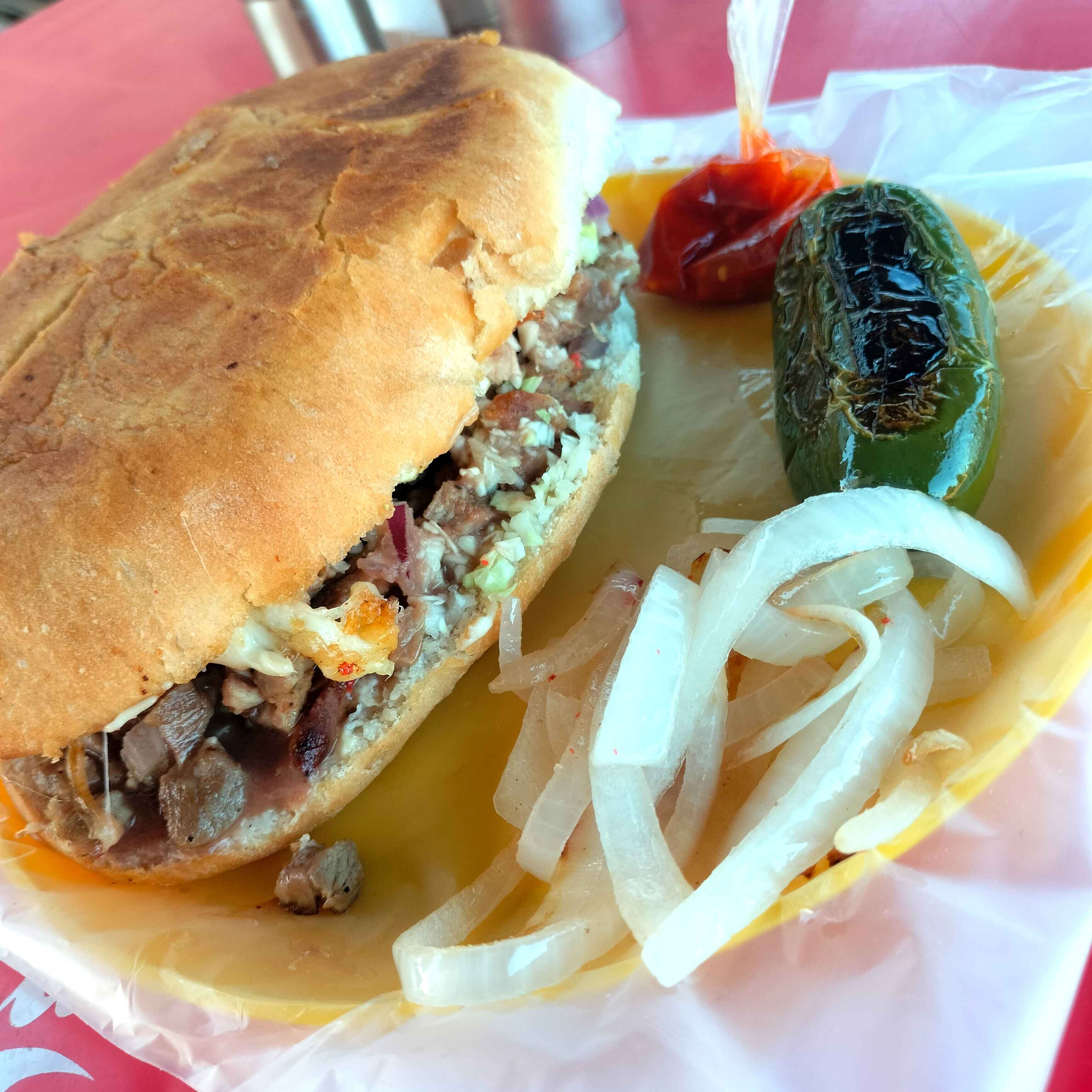 Pan,carne asada puerco,repollo,cebolla,rabanos,guacamole,chile toreado,salsas de la casa,chile toreado,costra de queso
