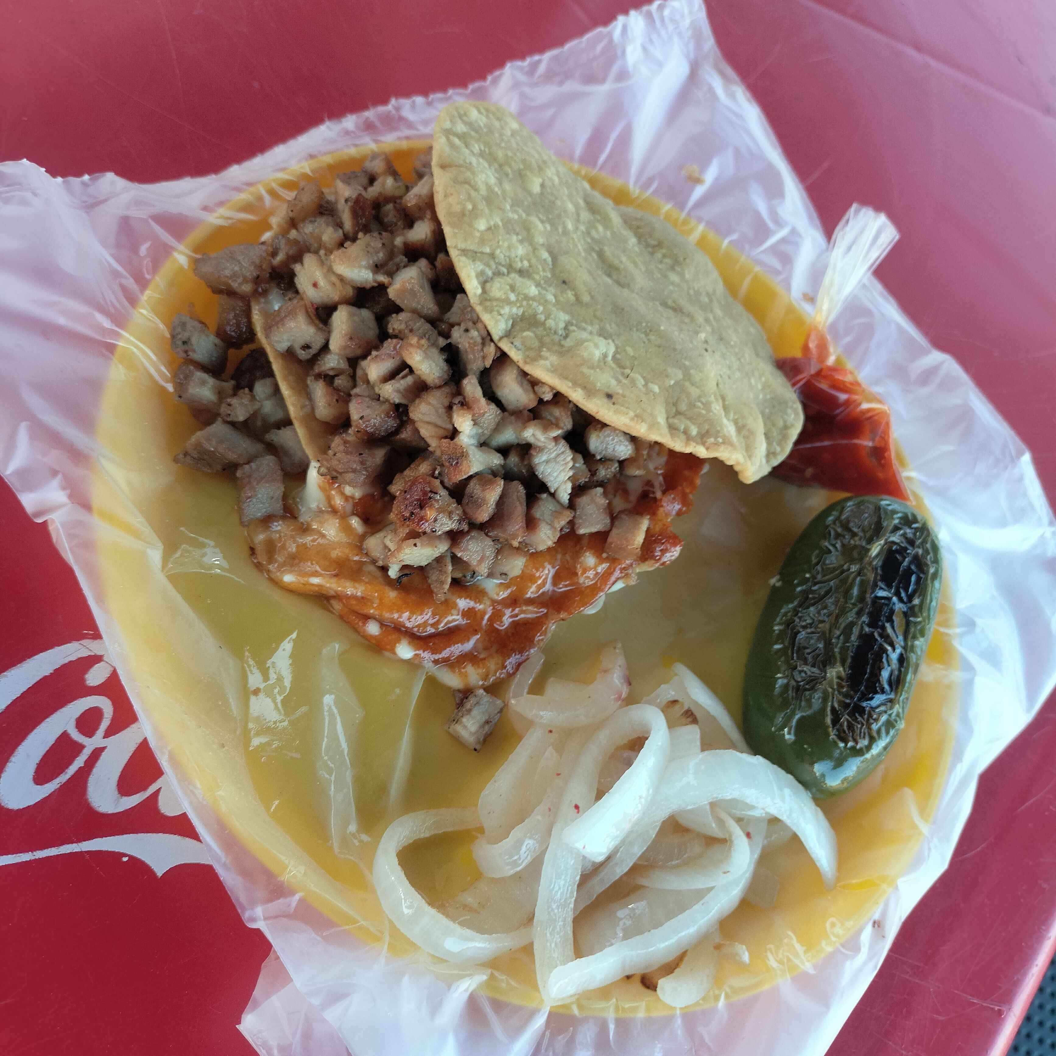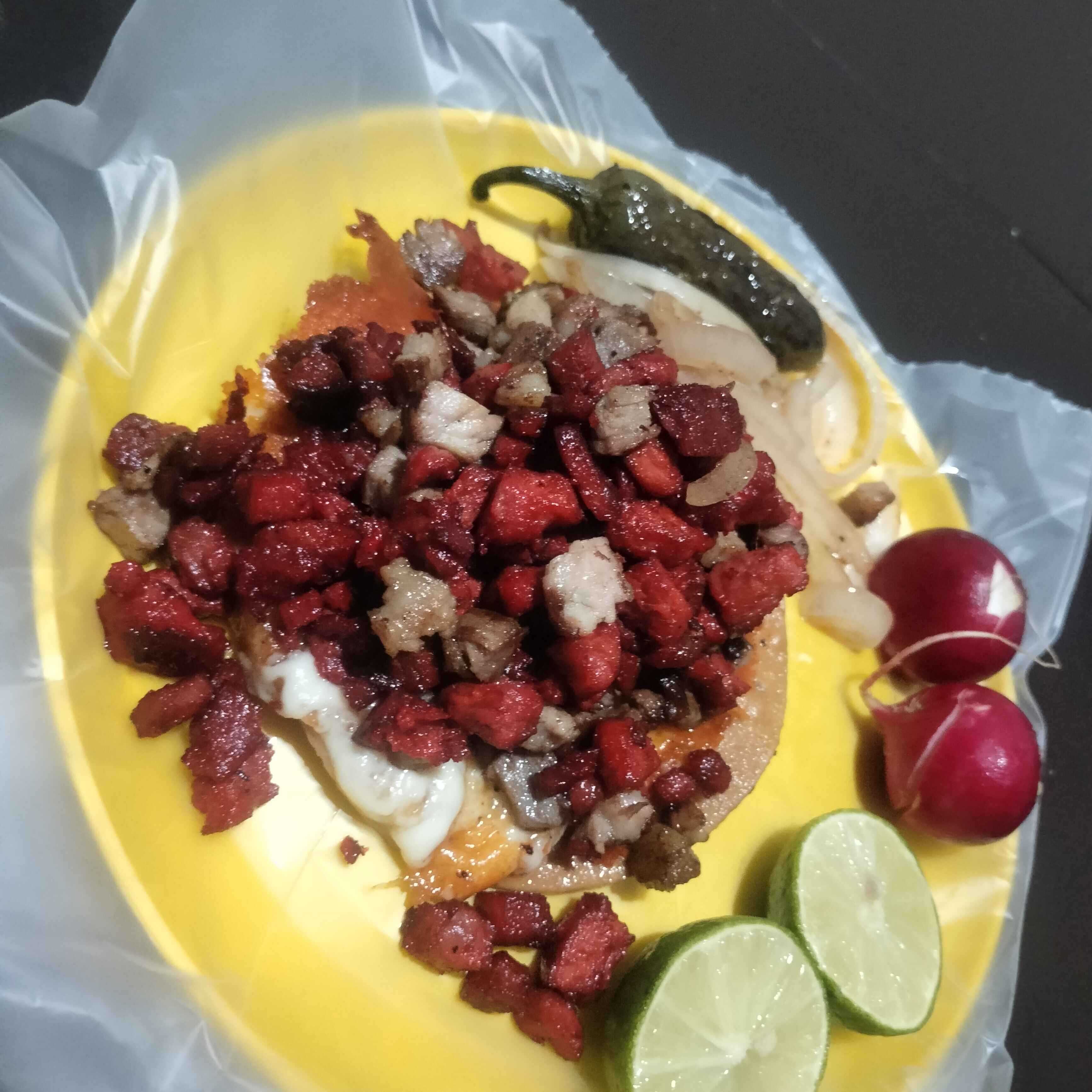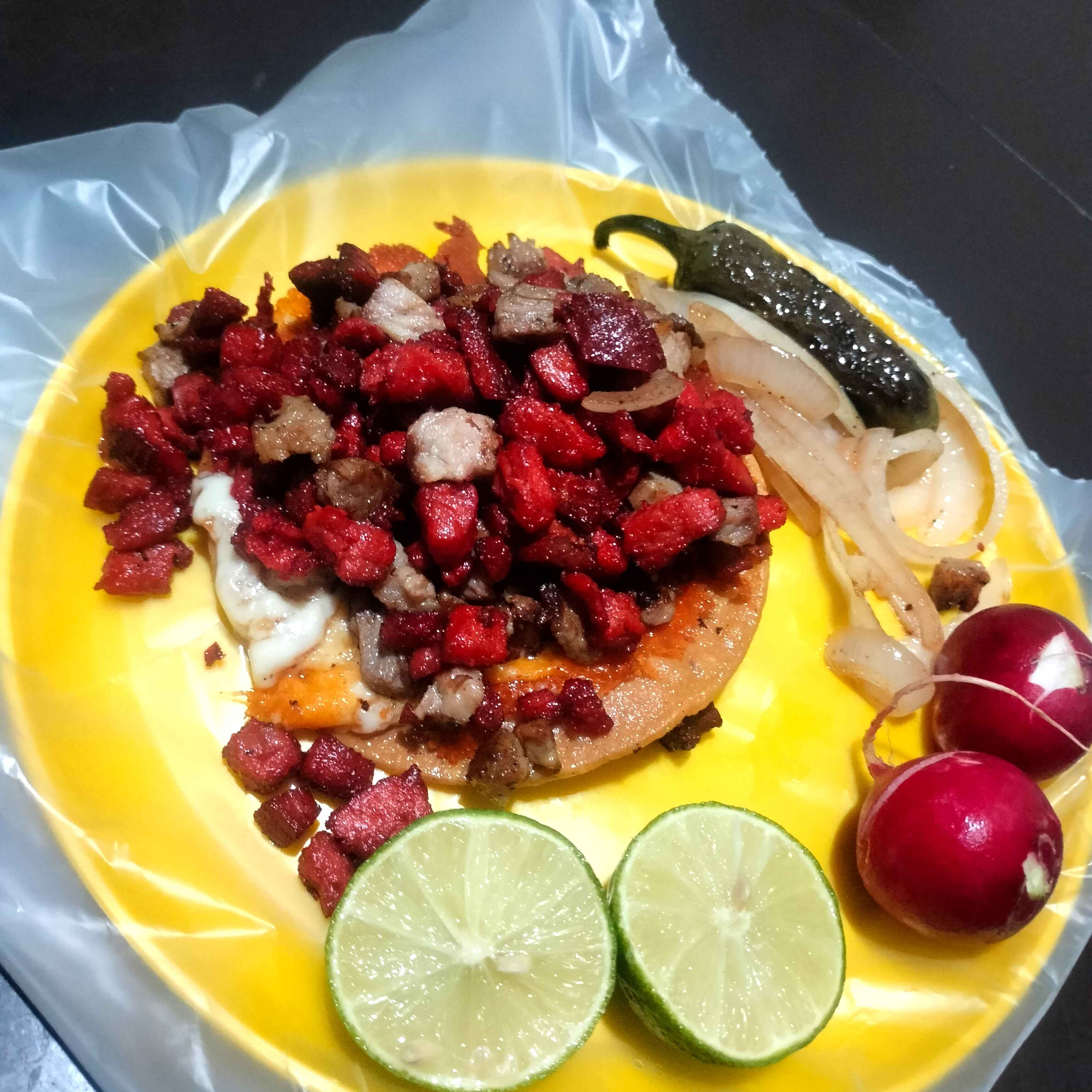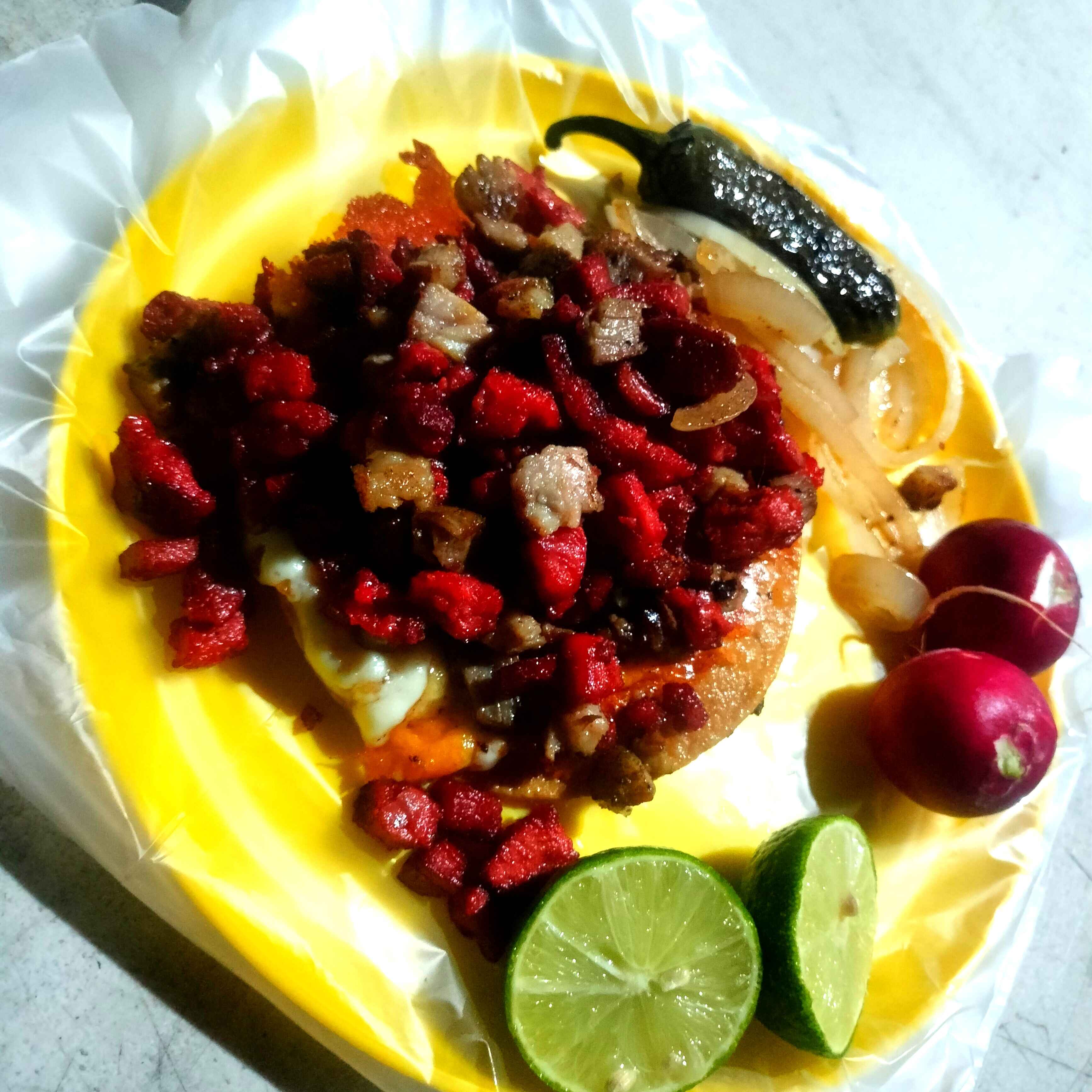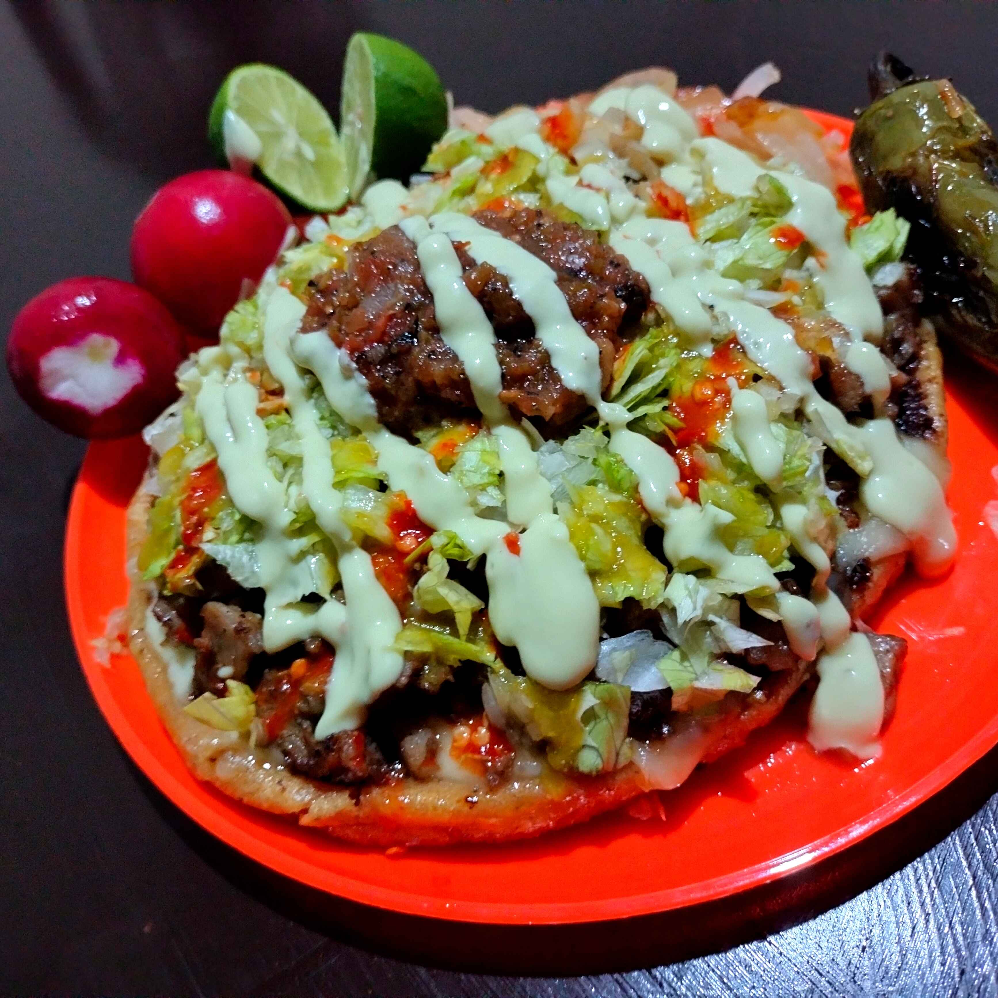 Tostada doble,costra de queso,carne asada y carne adobada de puerco,cebolla guisada,chile toreado,rabanos y salsas,guacamole,limon.