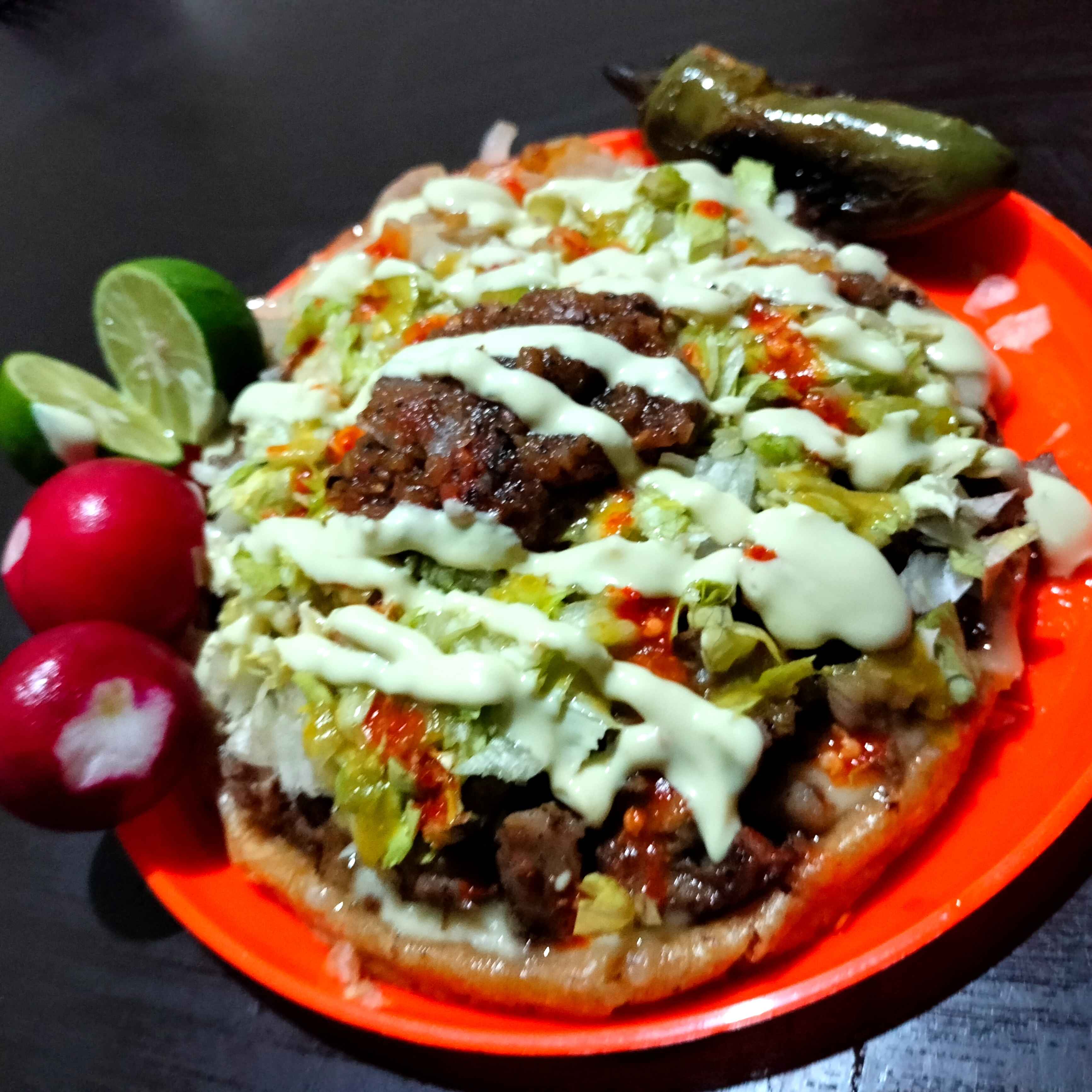 Tostada taquera de maiz,carne,costra de queso,repollo,guacamole,rábanos,cebolla guisada,chile toreado,y salsas de la casa ,limon,tostada extra sola.