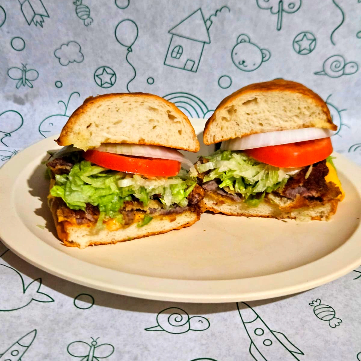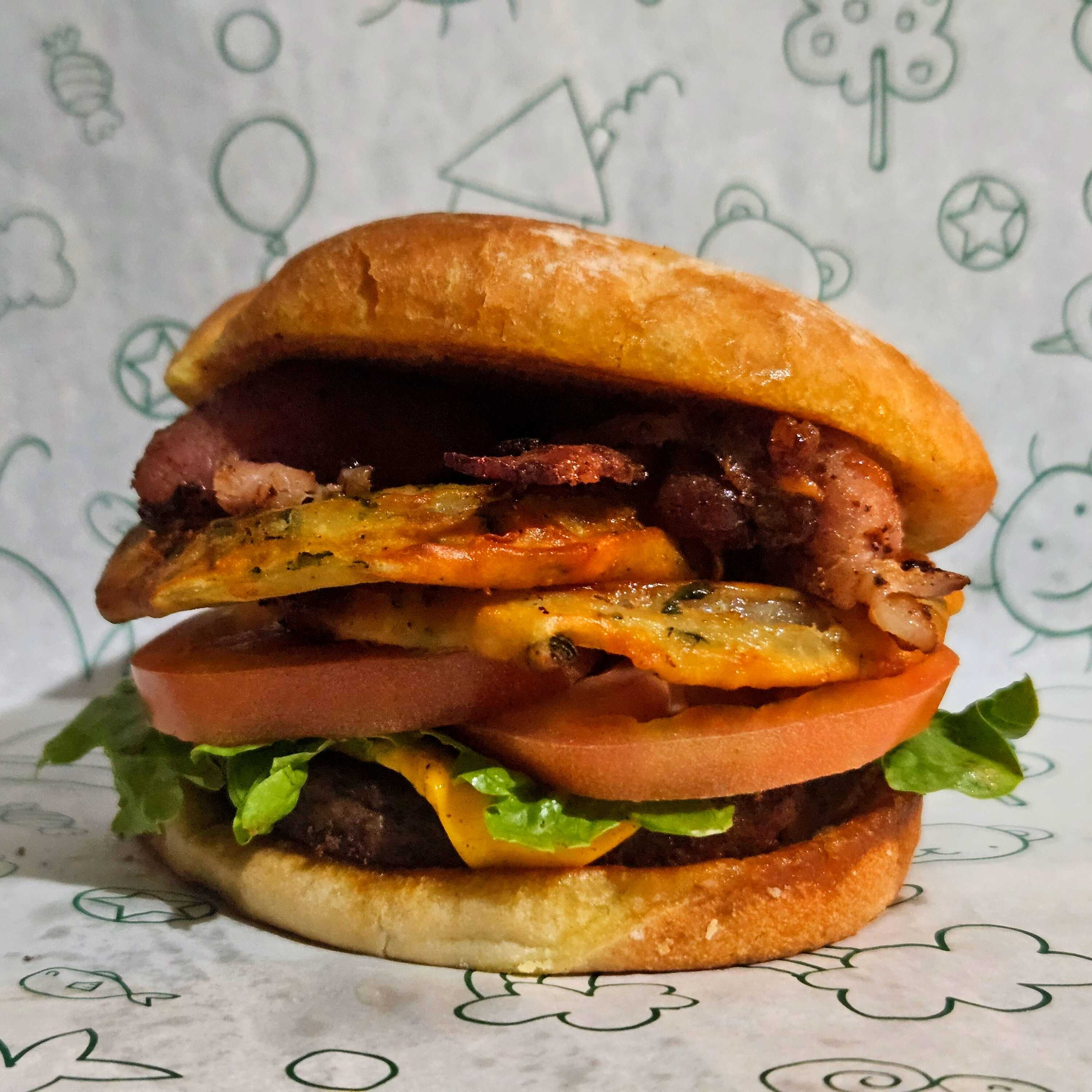 Lechuga , Tomate , Queso , Tocino , Aros de cebolla empanizados , BBQ