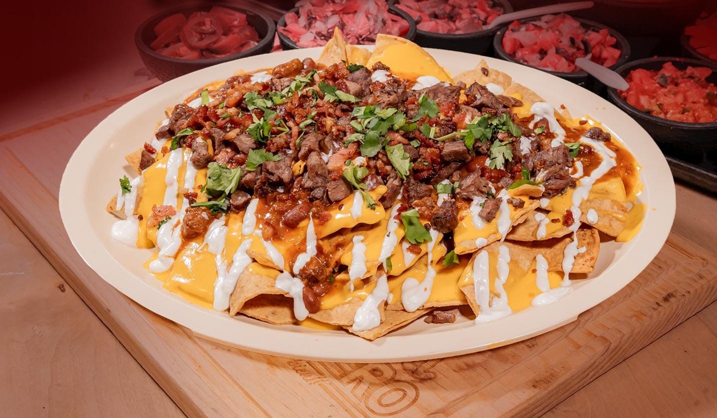 Totopos, queso amarillo, chilli beans, crema, tocino, guacamole especial y arrachera.