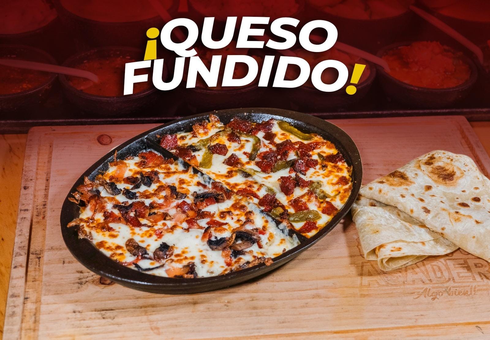 Queso fundido con combinación de chorizo con rajas y tocino con champiñones, acompañado de tortillas, tostadas o pan.