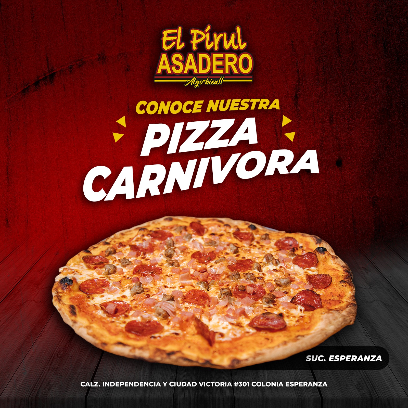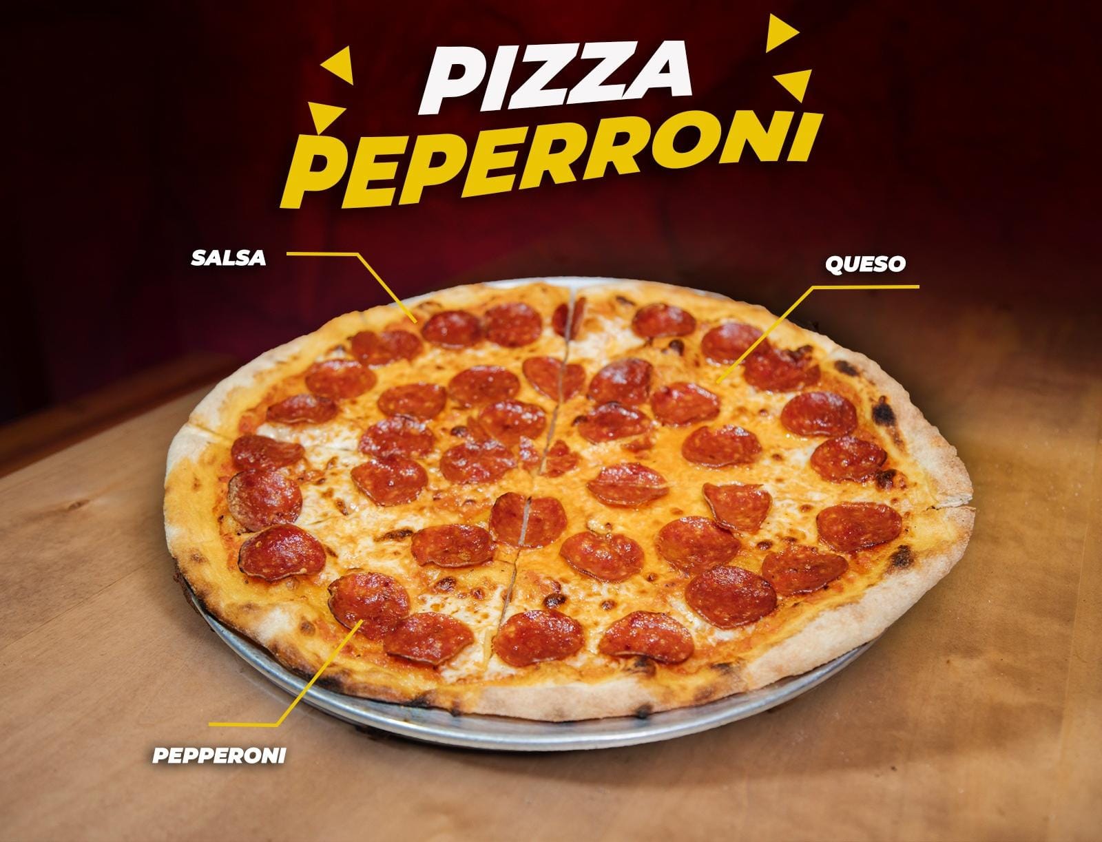 Salsa de la casa, queso, pepperoni, salchicha italiana, tocino y jamón.