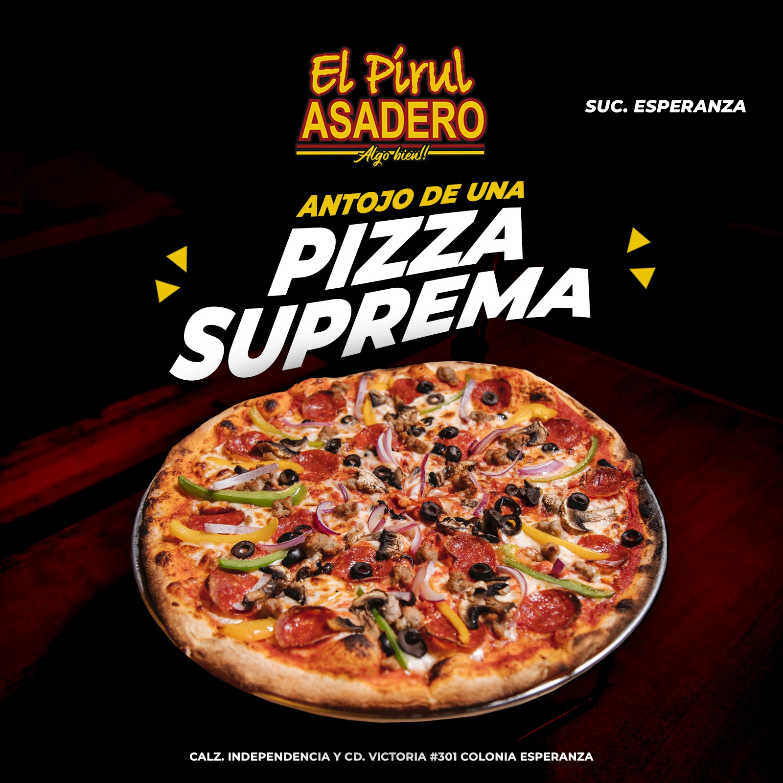 Salsa de la casa, queso, pimientos, cebolla morada, aceitunas, champiñones, pepperoni y salchicha italiana.