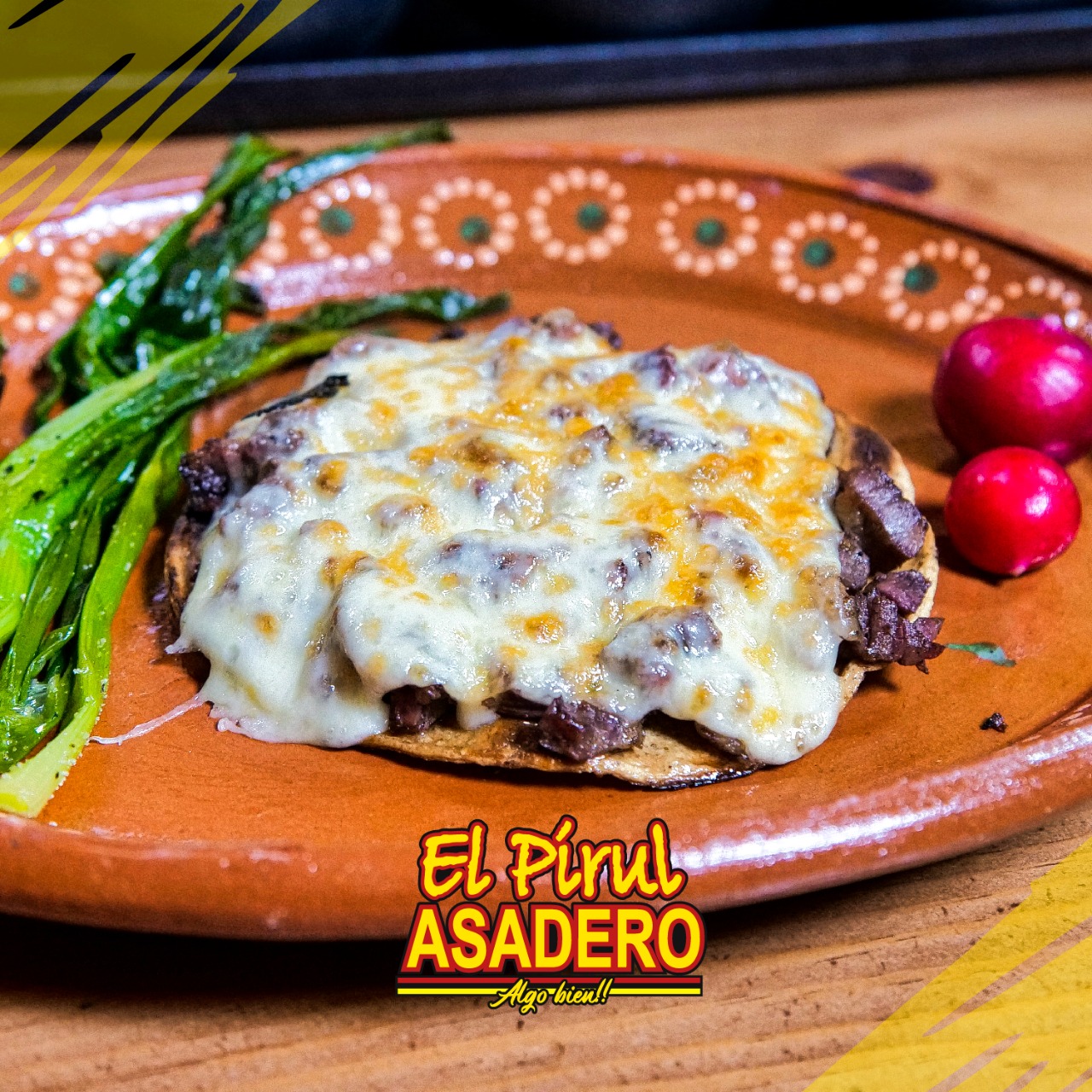 Salsa de la casa, queso, carne asada, jalapeños y cebolla.