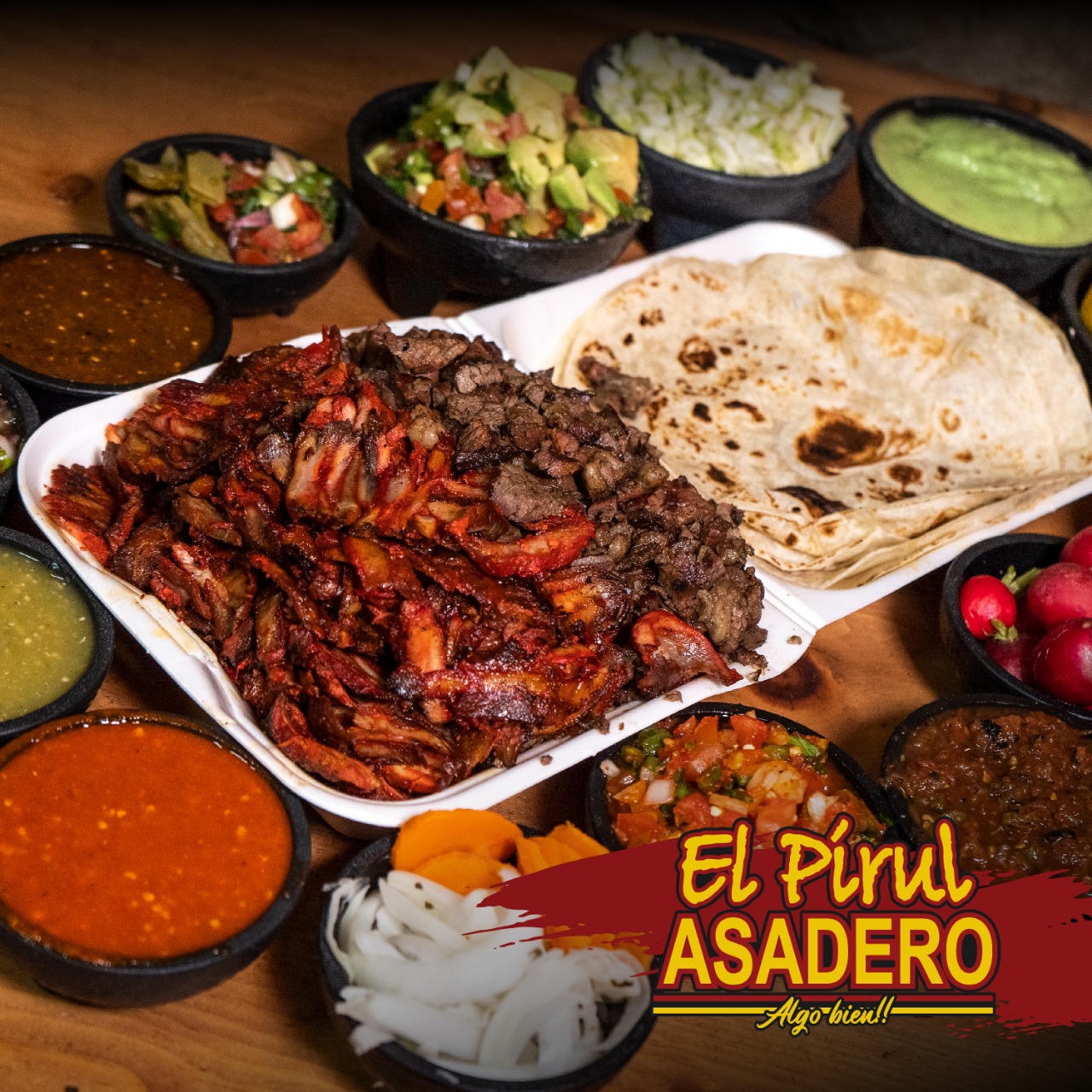 Carne de su elección, 24 tortillas. Acompañada de todas sus guarniciones, guacamole, salsas, verduras, frijoles, chiles asados y cebollitas asadas.