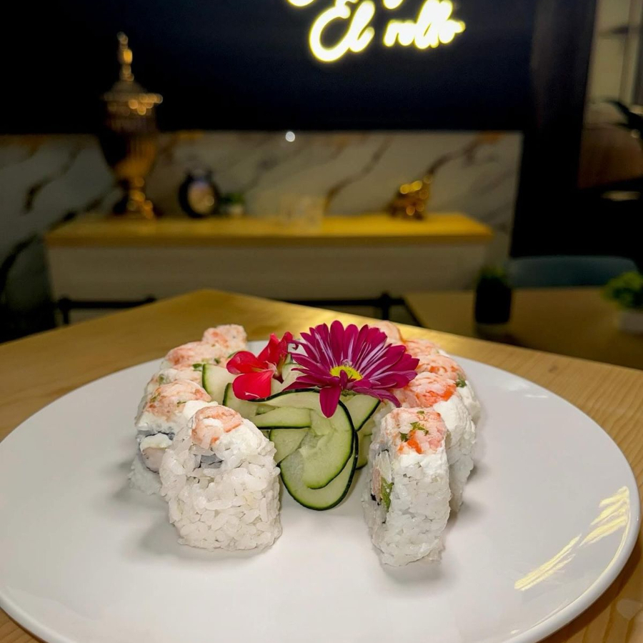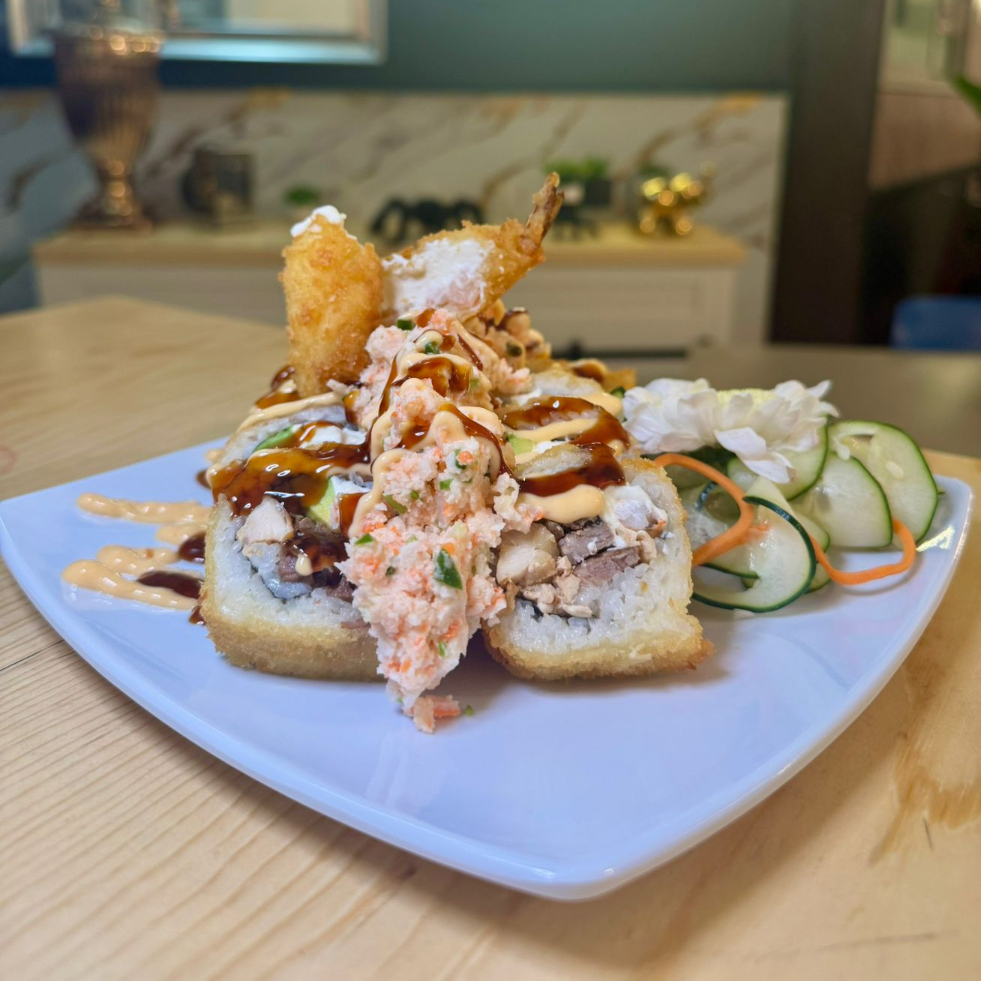 Por dentro Cielo, Mar y Tierra, queso crema, aguacate, empanizado con topping de tampico y camaron con queso y salsas de la casa.
