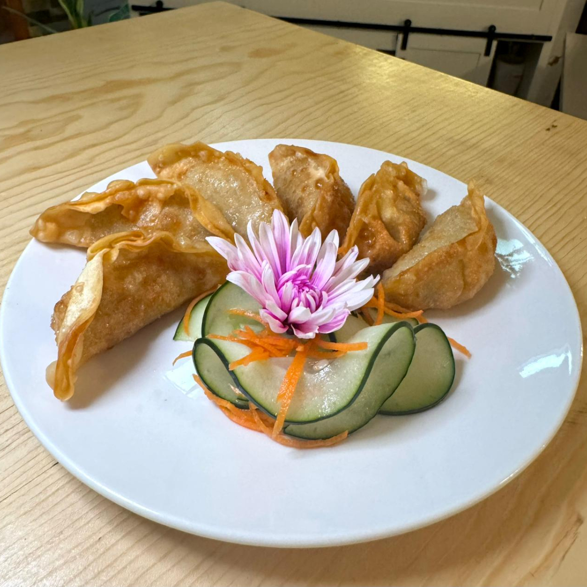 6 piezas fritas por dentro rellenas de pollo con verduras.