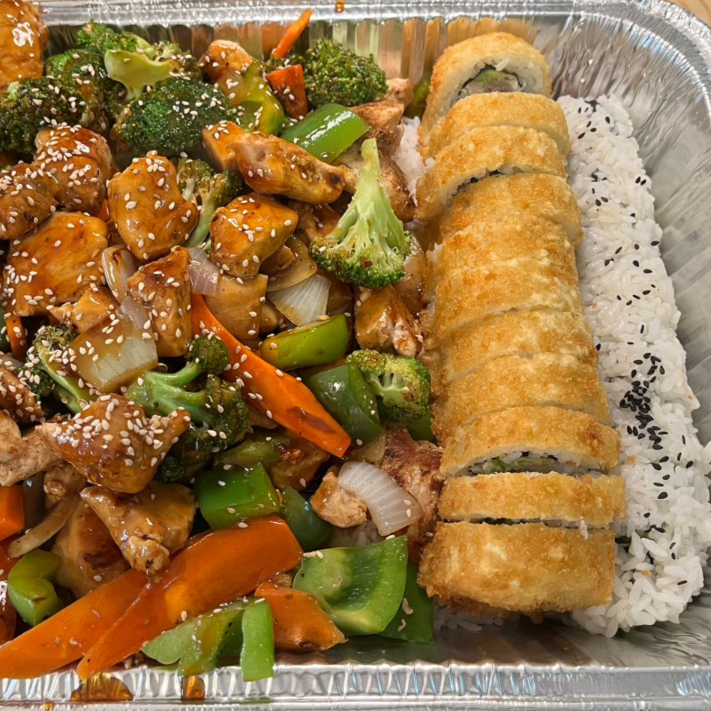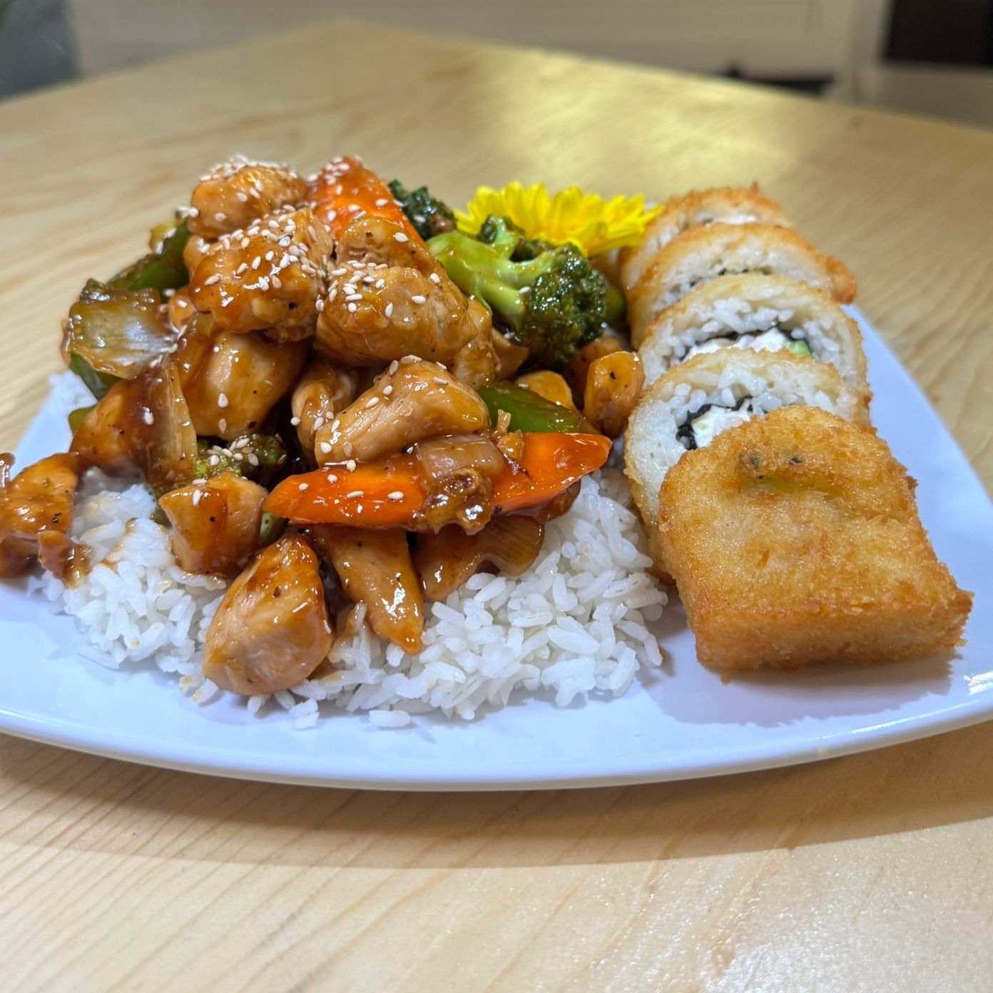 Mitad teriyaki y mitad rollos, dos rollos que pueden ser CMyTierra y california.