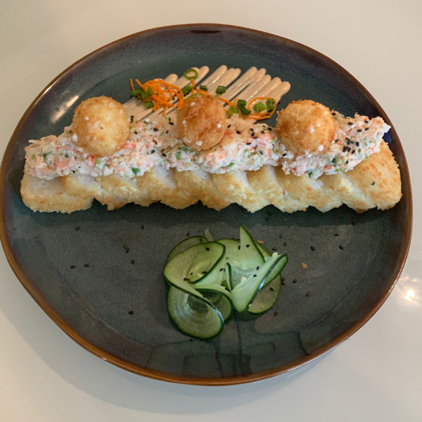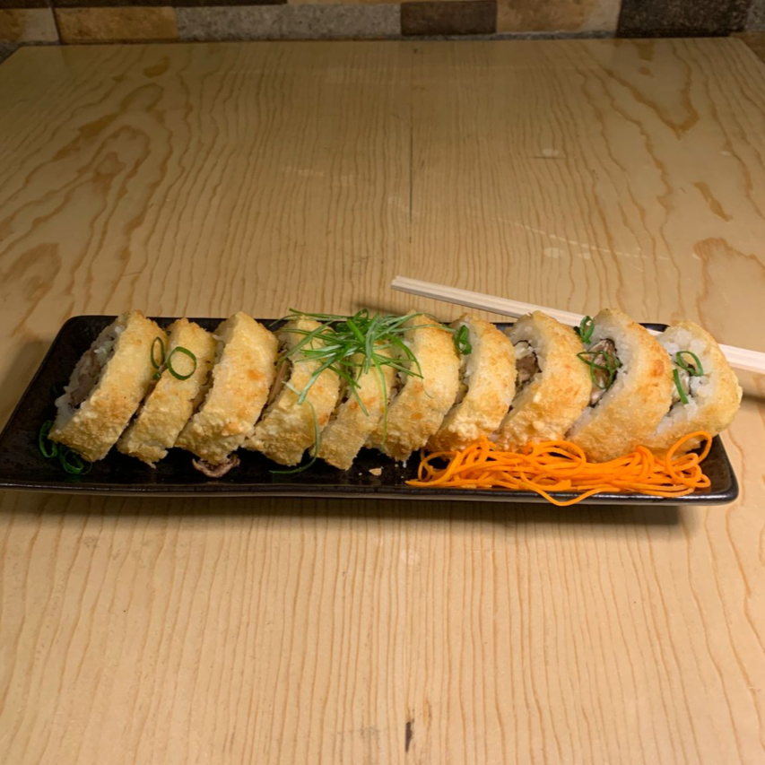 Por dentro queso, aguacate, surimi, empanizado y topping de tampico.