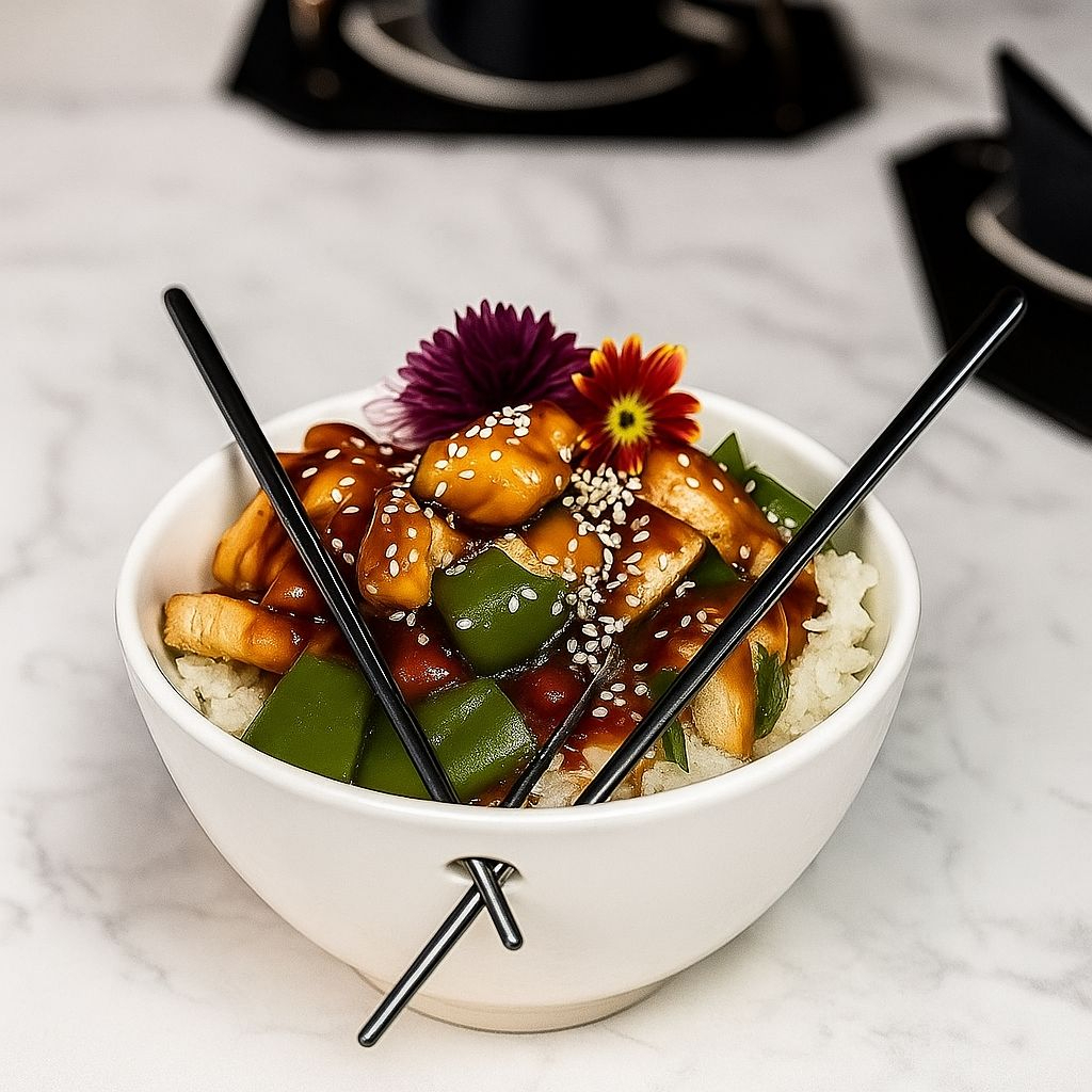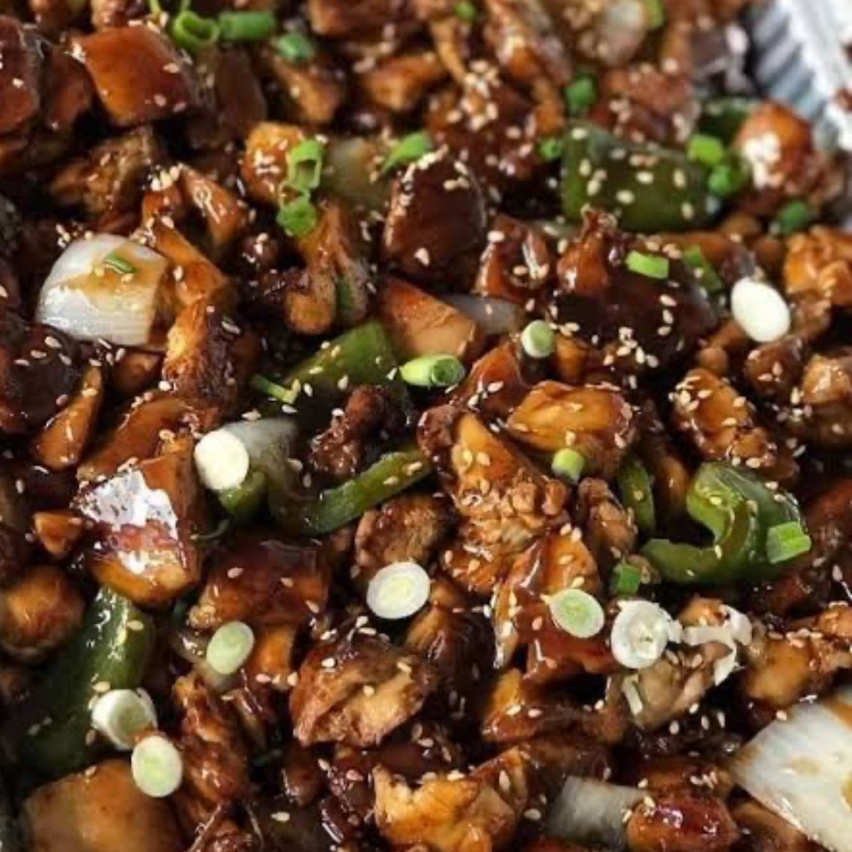Cama de arroz blanco, cebolla, chile morrón, brocoli y pollo con nuestra salsa especial.