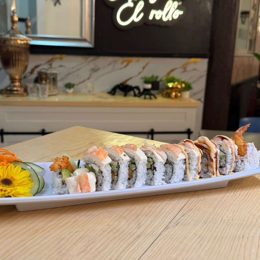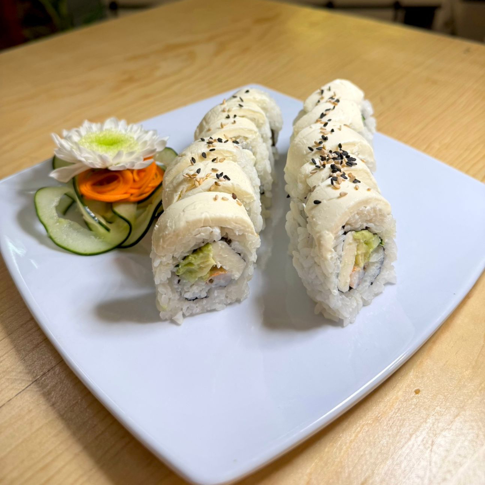 Por dentro aguacate, pepino, camarón empanizado, forrado de queso y camaron.