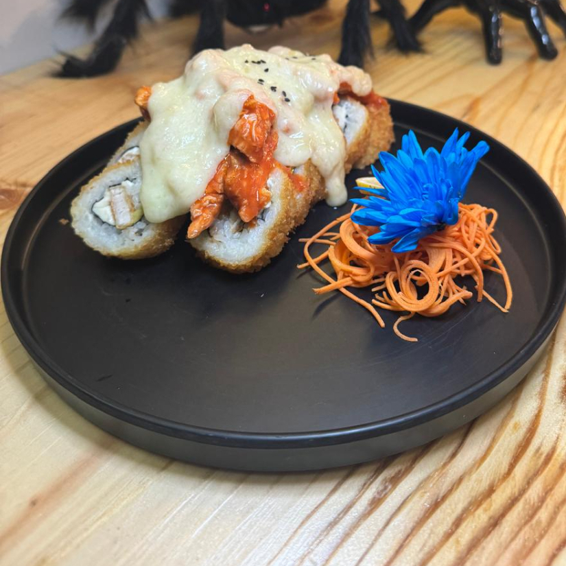 Por dentro queso crema, aguacate, pollo crujiente empanizado con topping de pollo buffalo ba;ado con queso monterrey