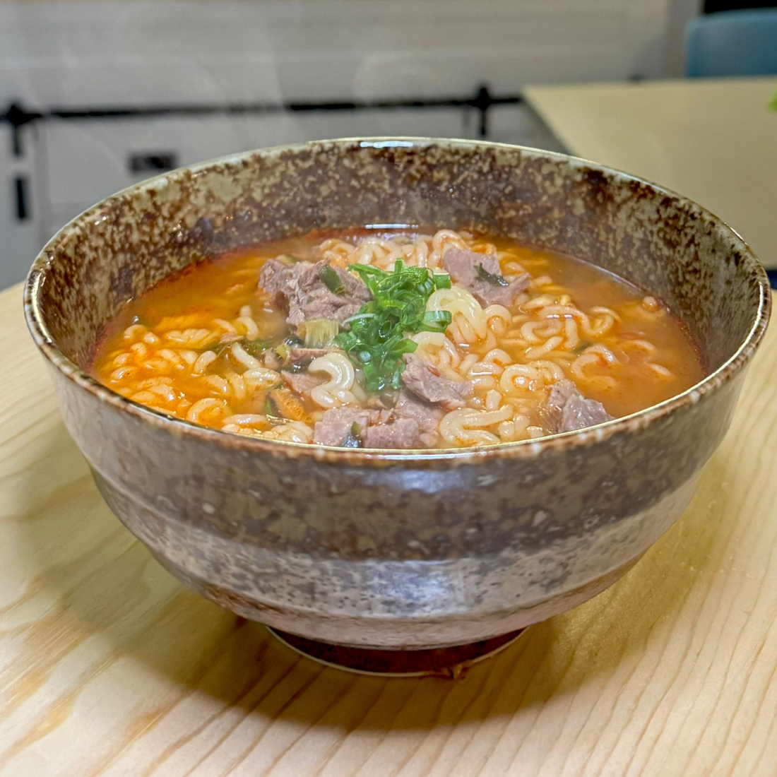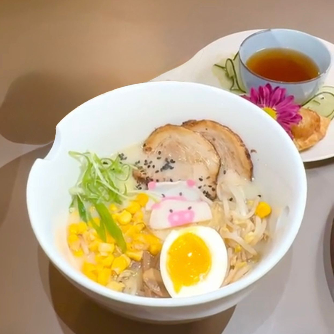 Base de puerco acompañada con panceta de cerdo, huevo, naruto, chop suey, hongo y elote.