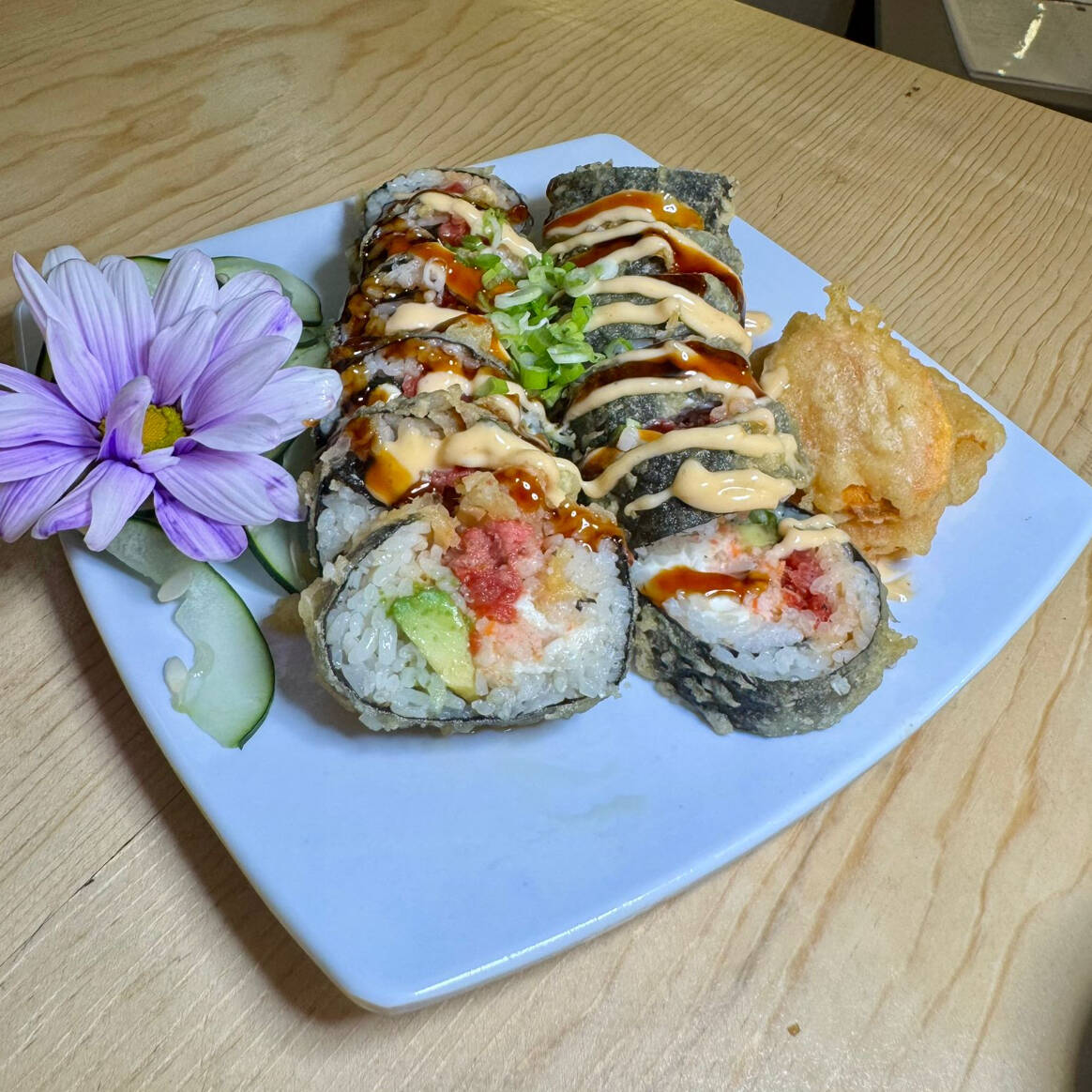 Por dentro queso, aguacate, tampico, atún picoso y bañado en salsas.