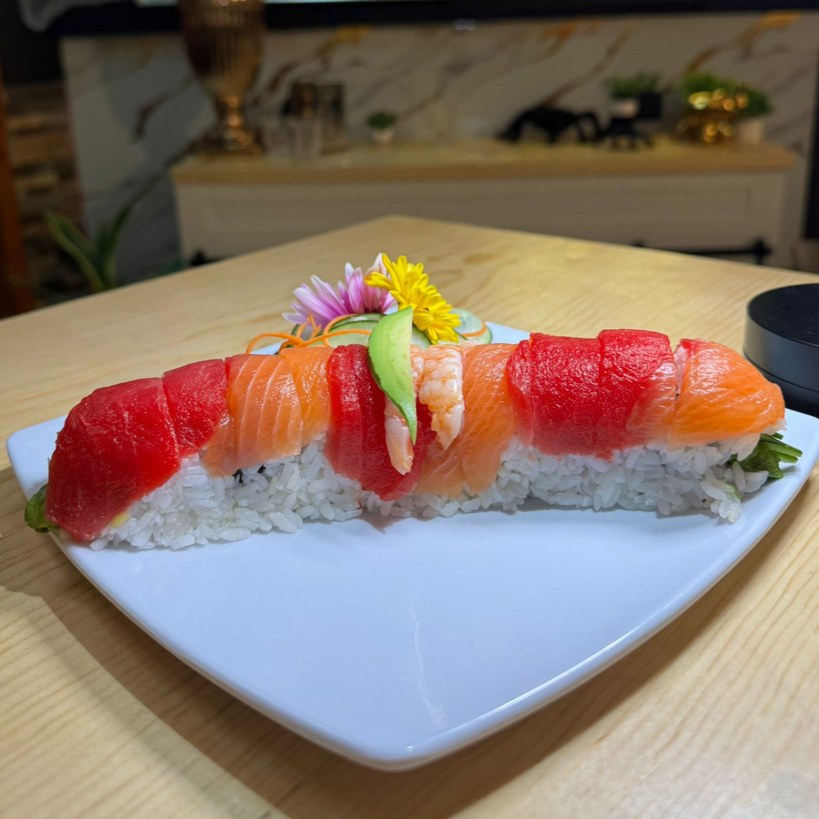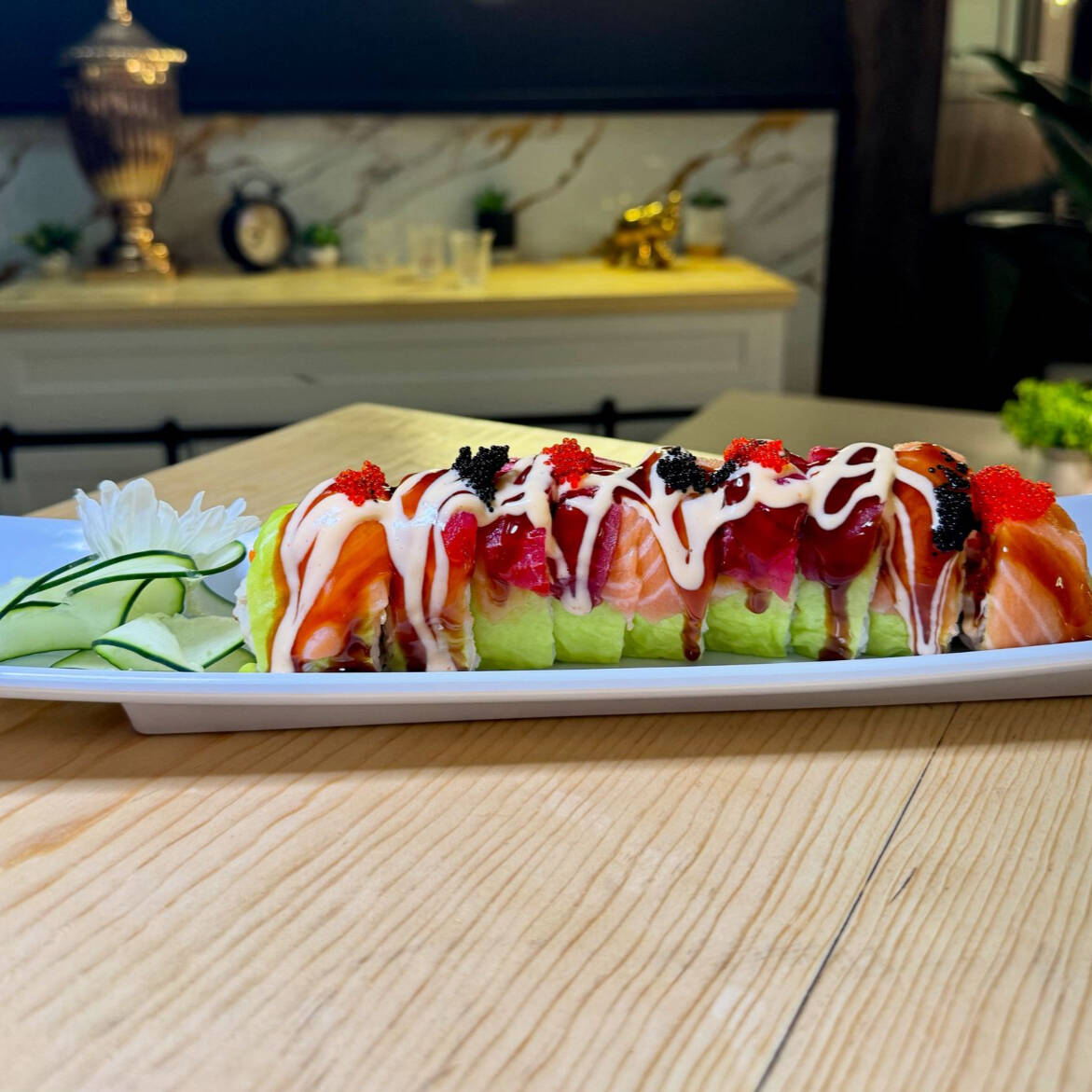 Por dentro anguila, surimi, aguacate, piel de salmón frita. Forrado de diferentes tipos de pescados.