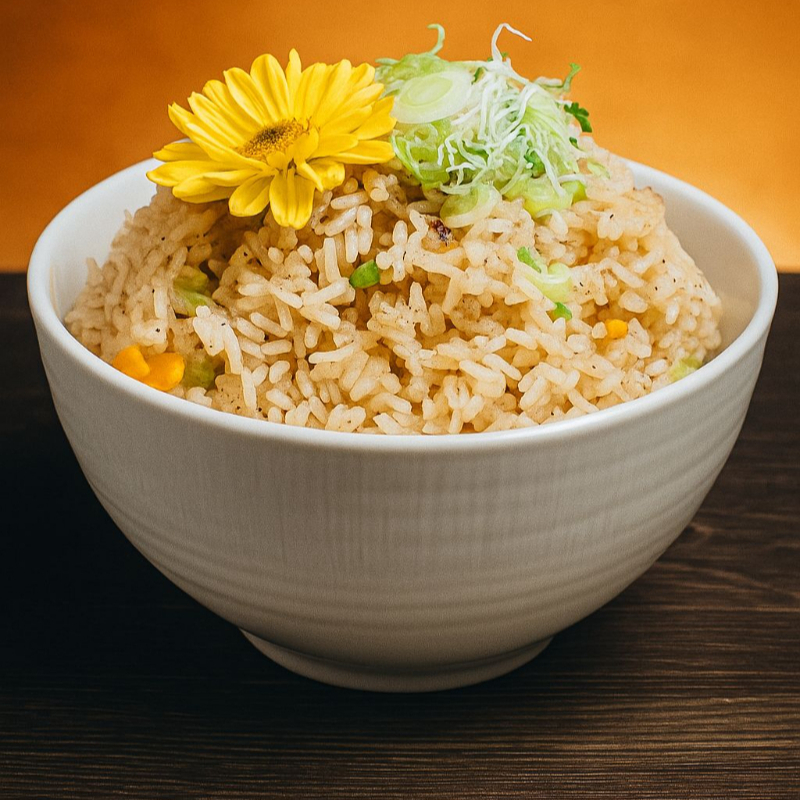 Arroz frito con verduras (calabacita, zanahoria y cebollín) a la plancha, pollo, res y camarón.