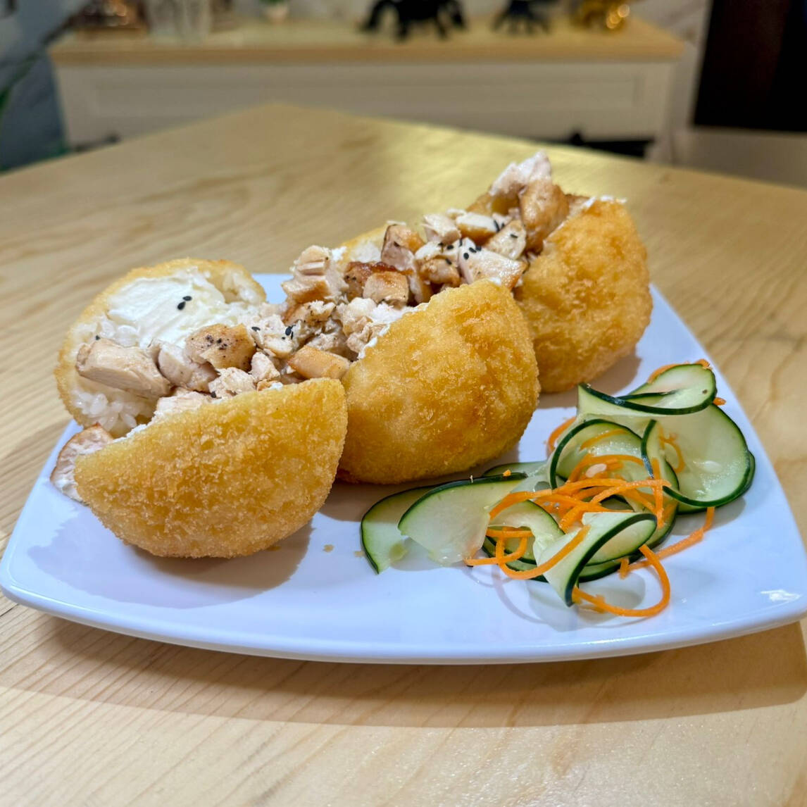 3 bolas de arroz rellenas de queso crema y camarón, res y pollo.